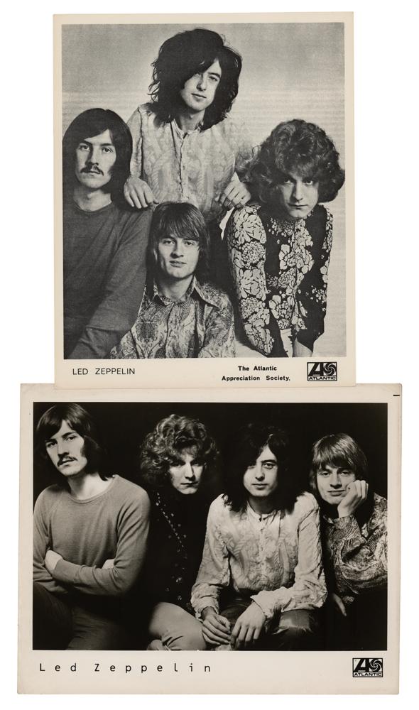 Two vintage circa 1969 Atlantic Records promotional items for Led Zeppelin—a glossy 10 x 8.25 photo of the band, showing Jimmy Page, Robert Plant, John Bonham, and John Paul Jones around the time of their debut album release; and a paperstock 8 x 10 photo of the band as issued by “The Atlantic Appreciation Society.” Given their wardrobes—only Plant has changed his attire—these images were most certainly taken during the same photo shoot. In overall fine condition.