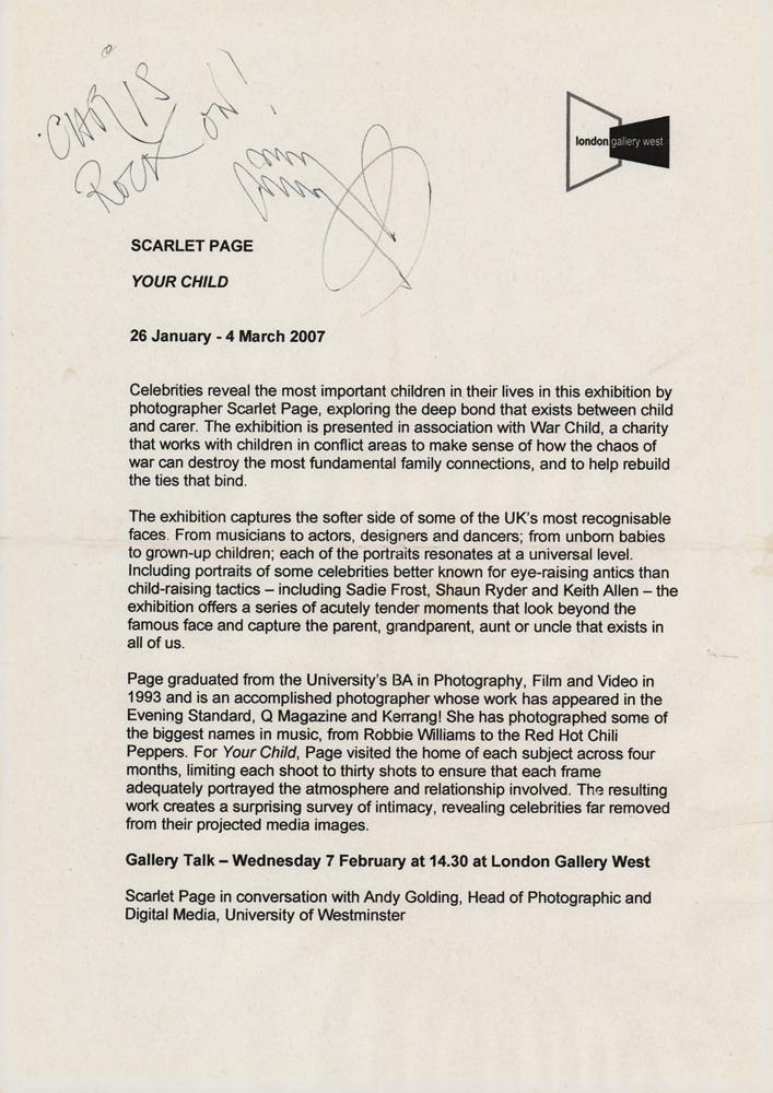 Information sheet for an exhibit by Scarlet Page, the daughter of Led Zeppelin guitarist Jimmy Page, entitled ‘Your Child,’ scheduled for display in London Gallery West at the University of Westminster from January 26th to March 4th, 2007, one page, 8.25 x 11.75, signed and inscribed in the upper right in black ink, “Chris, rock on! Jimmy Page.” In very good to fine condition, with overall creasing and intersecting folds.