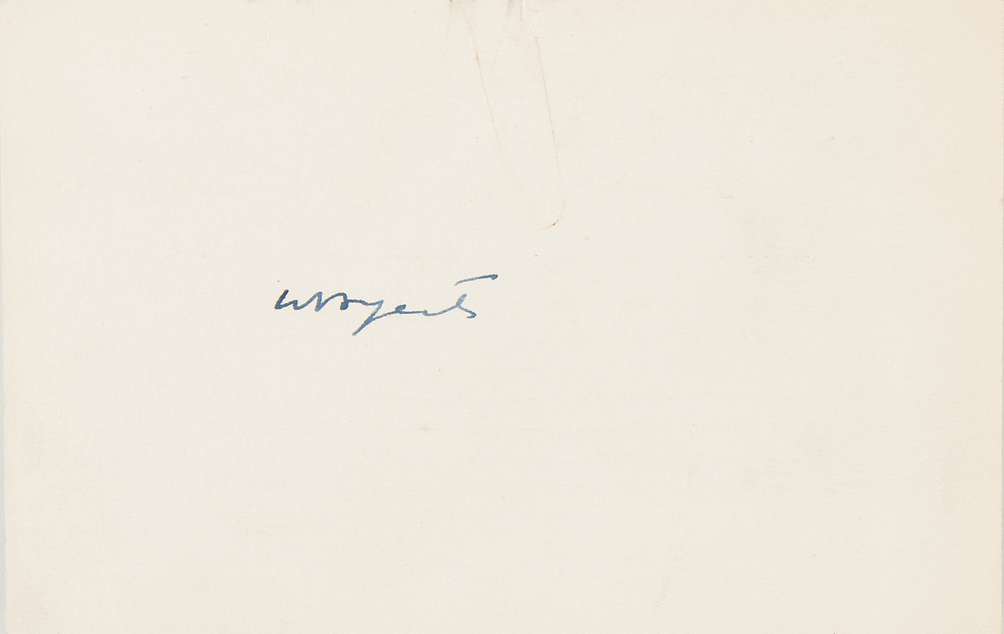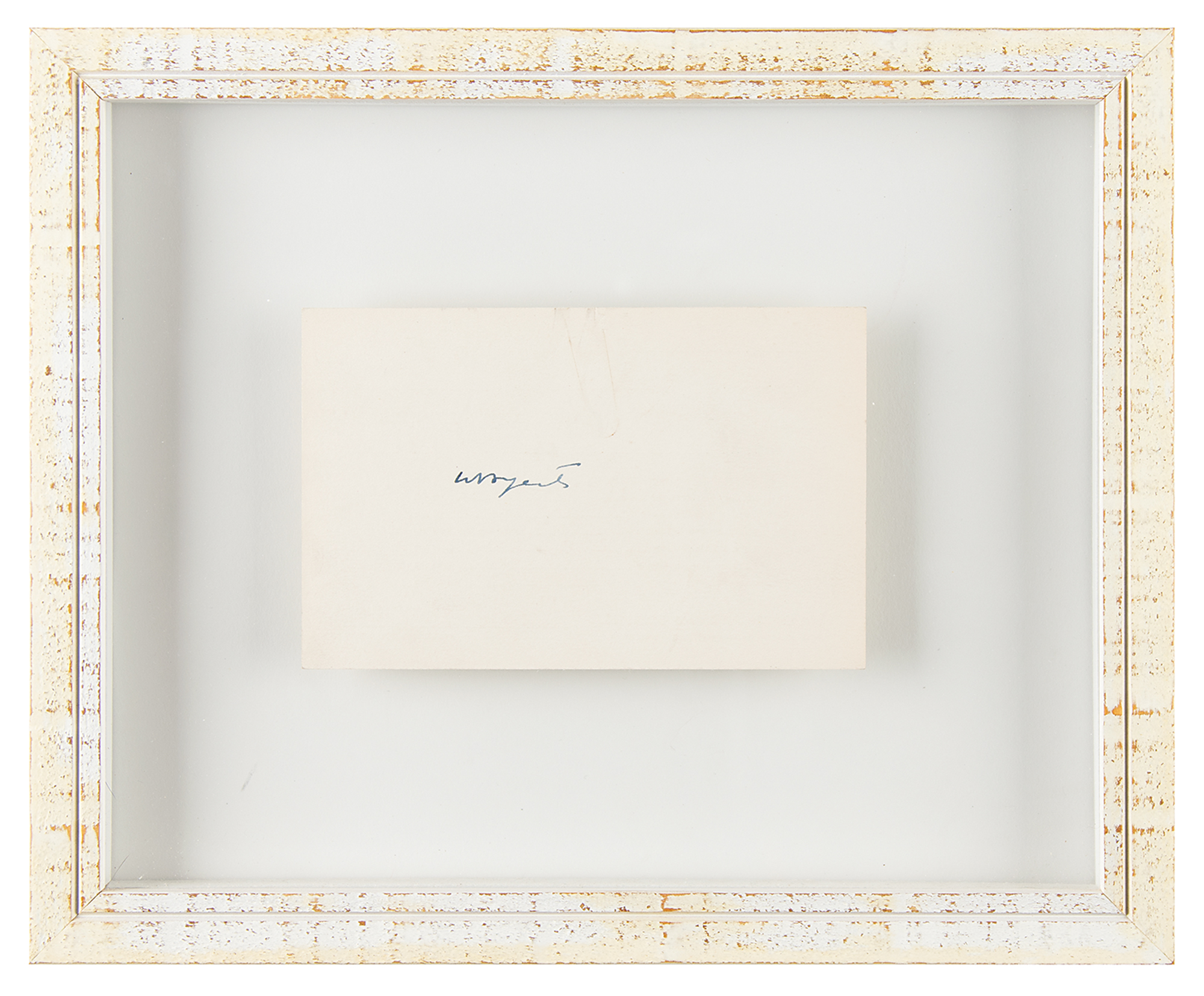 Vintage fountain pen signature, "W. B. Yeats,” on the reverse of an off-white 5.5 x 3.5 membership card for the Society of Arts and Sciences. Framed with glass on both sides to an overall size of 11 x 9. In fine condition, with a light paperclip impression to the top.