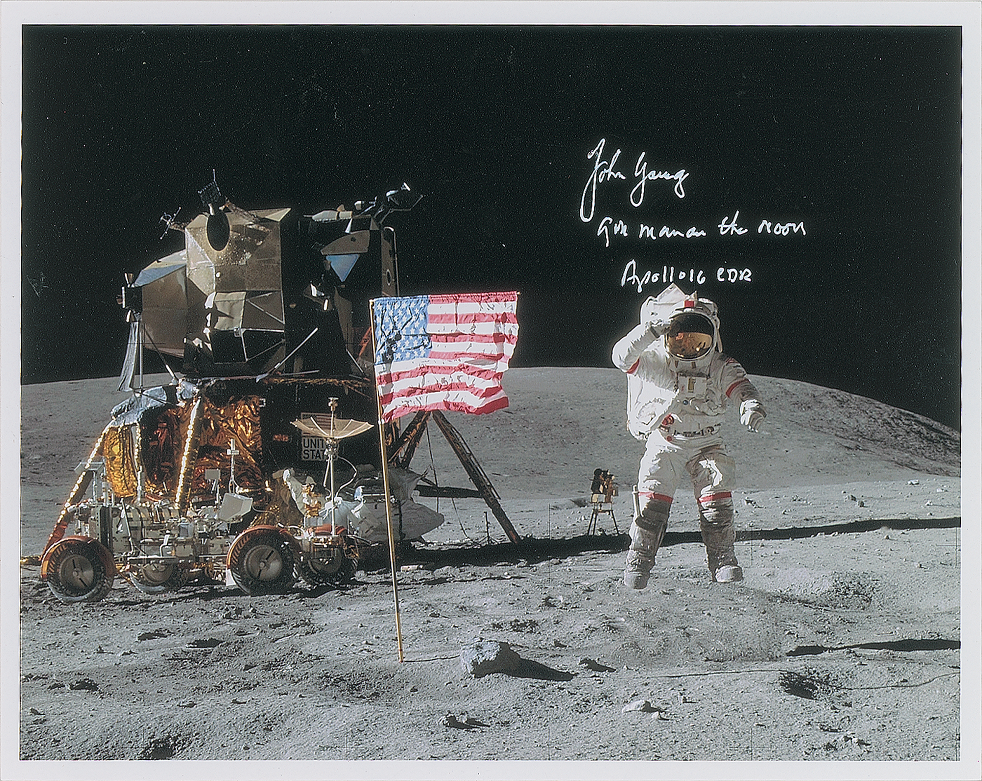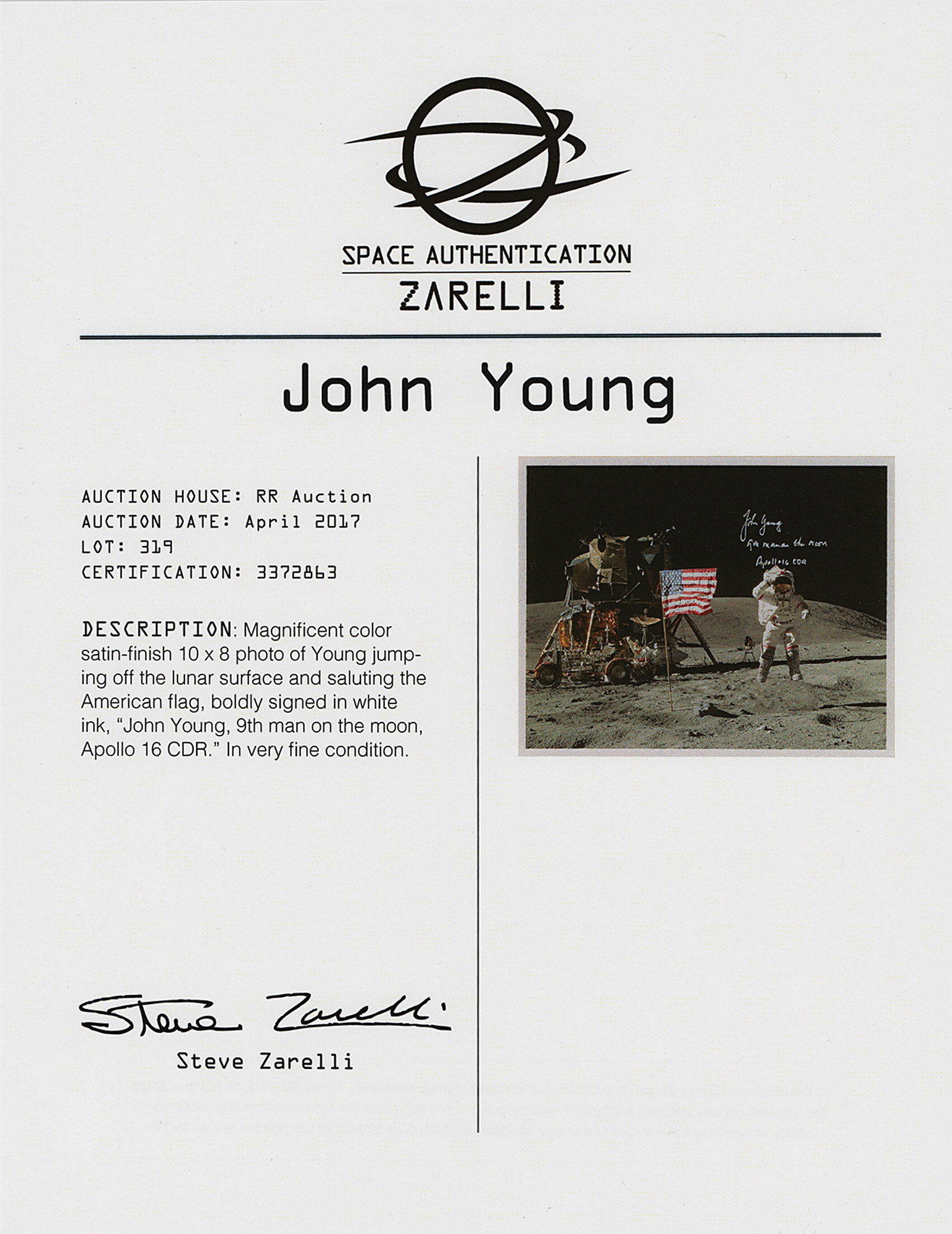 Magnificent color satin-finish 10 x 8 photo of Young jumping off the lunar surface and saluting the American flag, boldly signed in white ink, "John Young, 9th man on the moon, Apollo 16 CDR." In very fine condition. Accompanied by a full letter of authenticity from Zarelli Space Authentication.