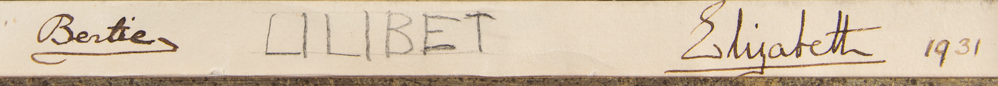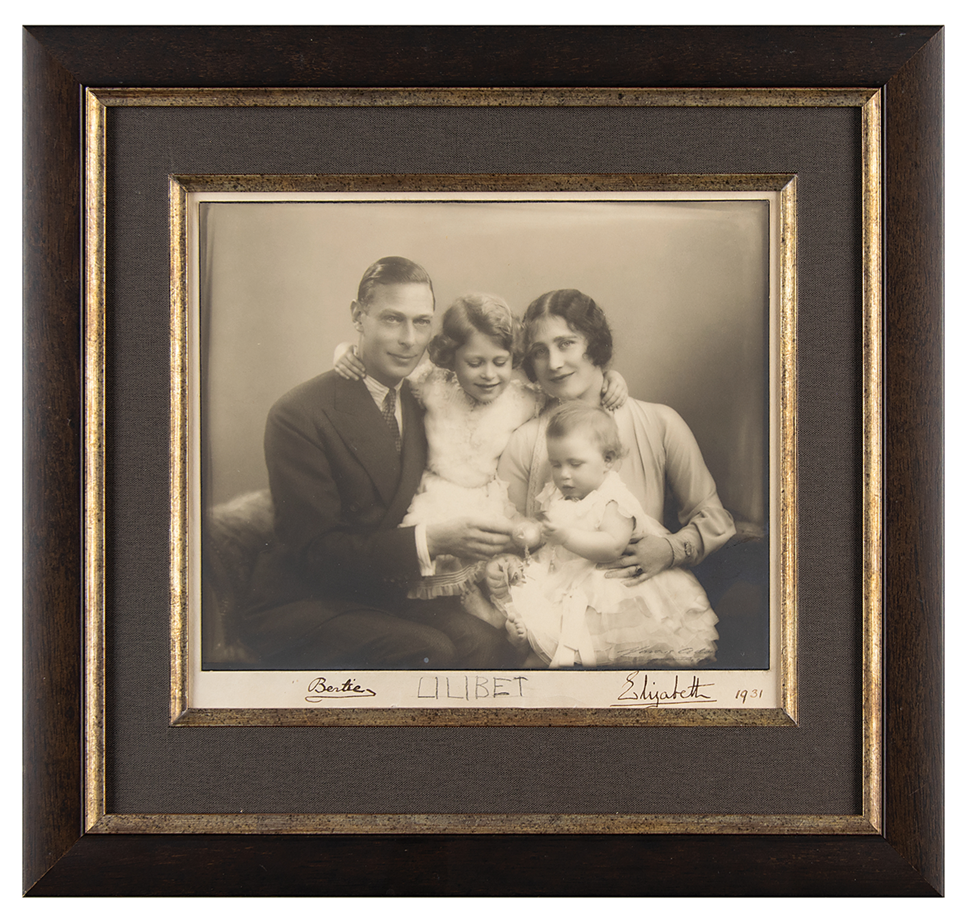Absolutely incredible vintage matte-finish 8 x 6.5 portrait of the royal family happily posing together in 1931, affixed to its original 8.5 x 7.5 mount, signed on the mount in pencil by the 5-year-old future Queen Elizabeth II, "Lilibet," and in fountain pen by her parents, the future King George VI, "Bertie," and Queen Elizabeth, The Queen Mother, "Elizabeth." Handsomely archivally matted and framed under museum glass to an overall size of 13 x 12.25. In fine condition, with a small crease in the bottom border. A remarkable royal portrait and certainly one of the earliest known signed photographs of Queen Elizabeth II.