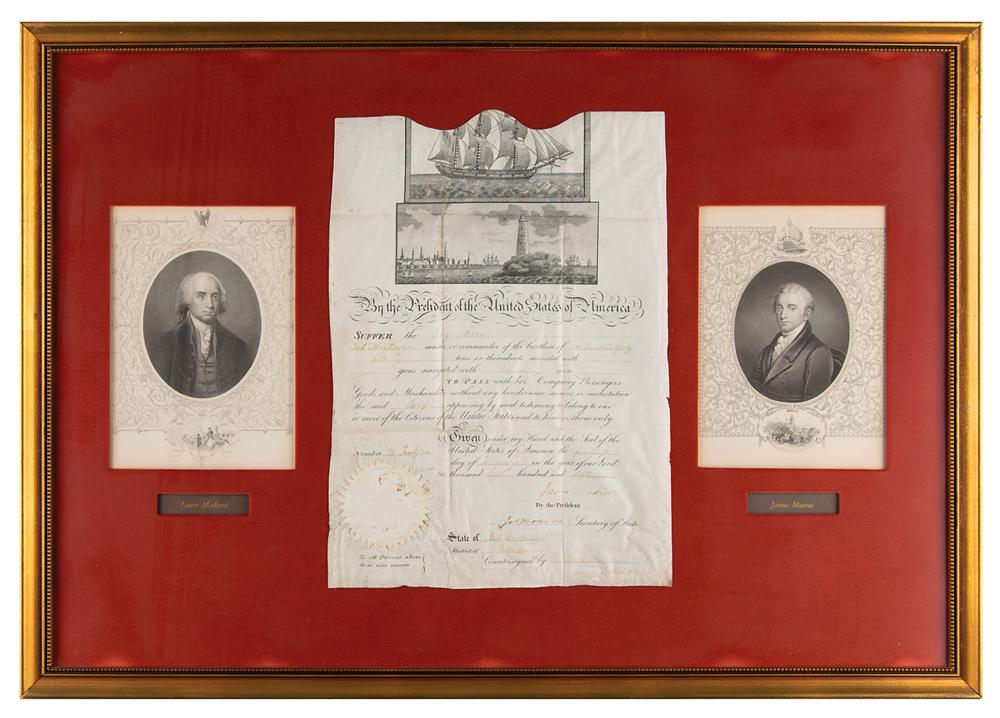 Partly-printed vellum DS, signed “James Madison" as president and "Jas. Monroe" as secretary of state, one page, 10.75 x 15, February 14, 1815. Scalloped-top ship's pass issued to the "Brig Avon, Joel Manlove master of commander?To Pass with her Company Passengers Goods and Merchandize without any hinderance seisure or molestation." Signed at the conclusion by President Madison and Secretary of State Monroe. The white paper seal affixed to the lower left remains intact. Handsomely mounted, cloth-matted, and framed with portraits and engraved nameplates to an overall size of 30.5 x 21.5. In very good to fine condition, with overall wrinkling and rippling, and all of the handwriting a couple of shades light.