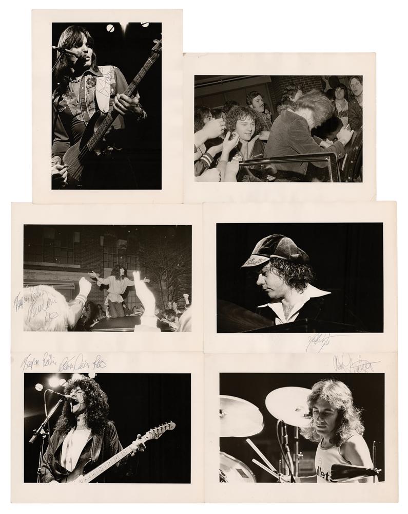 Excellent group lot of six vintage semi-glossy 14 x 11 silver gelatin photos of REO Speedwagon, showing band members during and following a concert from the late 1970s / early 1980s, each individually signed in black ballpoint by a musician: Kevin Cronin (2), who adds “Keep on Rollin” and “REO” to both, Bruce Hall (2), Neal Doughty, and Alan Gratzer. In overall fine condition, with light rippling and creasing to edges.