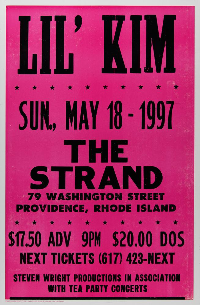 Hot pink 17 x 26 boxing-style window card poster for a Lil’ Kim concert at The Strand in Providence, Rhode Island, on May 18, 1997, featuring bold black text against the bright background. In fine condition.