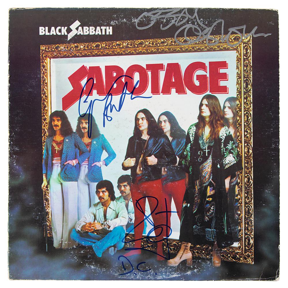 Sabotage album by Black Sabbath, signed on the front cover in silver ink by Ozzy Osbourne, and in blue felt tip by Geezer Butler and Bill Ward, who adds "D.C." In very good condition, with overall scuffing, and complete edge separation along the spine. The record is included.