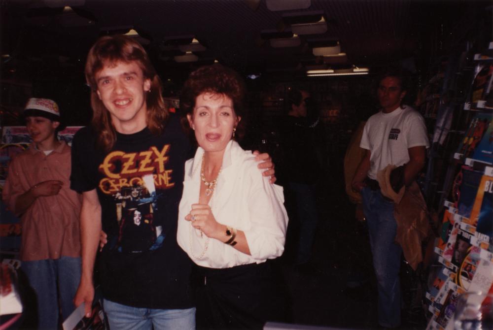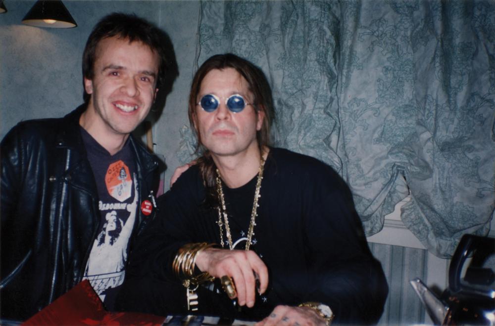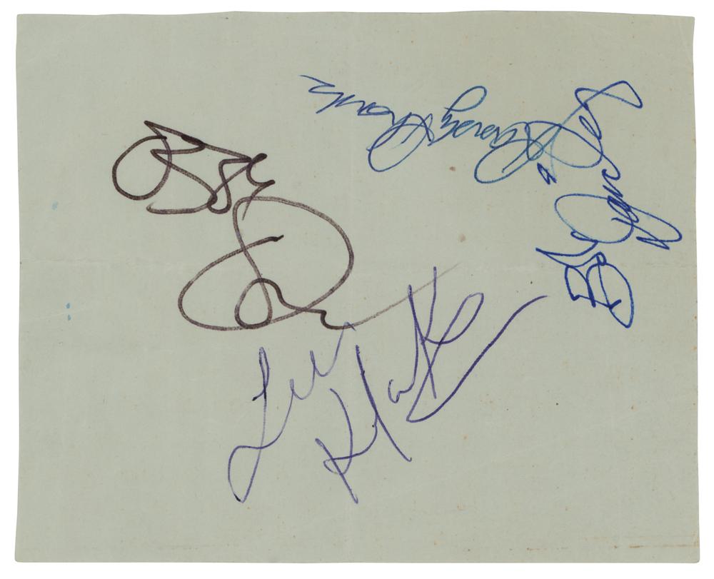 Ink and felt tip signatures of Black Sabbath’s Ozzy Osbourne, Randy Rhoads, Bob Daisley, and Lee Kerslake on an off-white 6 x 5 sheet. In very good to fine condition, with intersecting folds and overall creasing. Accompanied by two photos of the original recipient posing with Ozzy and Sharon Osbourne. Metal fans should salivate over this Blizzard of Oz autograph lineup, which includes the rare presence of guitar great Randy Rhoads, who died at the age of 25.