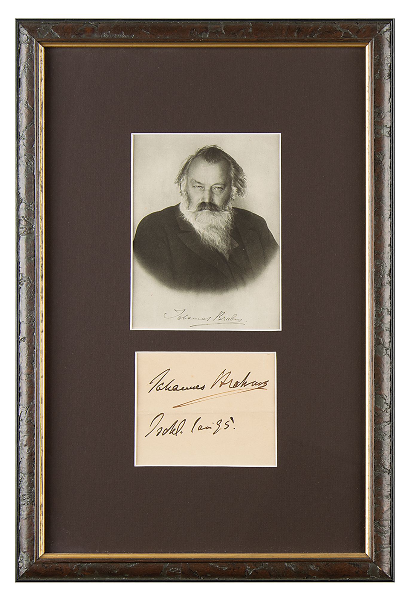 Large and bold ink signature, "Johannes Brahms,” with date below, on an off-white 3.75 x 3 slip. Nicely archivally matted and framed with a portrait (featuring a facsimile signature) to an overall size of 10.25 x 15.25. In fine condition, with a central horizontal fold.