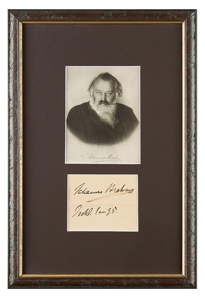 Large and bold ink signature, "Johannes Brahms,” with date below, on an off-white 3.75 x 3 slip. Nicely archivally matted and framed with a portrait (featuring a facsimile signature) to an overall size of 10.25 x 15.25. In fine condition, with a central horizontal fold.