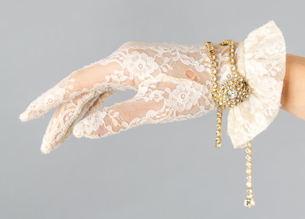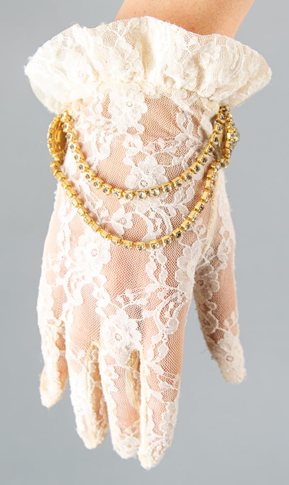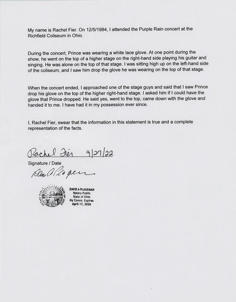Prince's stage-worn white lace right-handed glove from his concert at the Richfield Coliseum in Ohio on December 5, 1984, during his iconic Purple Rain Tour. The delicate glove features an ornate sewn-on golden bracelet encrusted with faux diamonds. In fine condition, with expected light wear from use. Accompanied by a notarized letter of provenance from the owner, in part: "On 12/5/1984, I attended the Purple Rain concert at the Richfield Coliseum in Ohio. During the concert, Prince was wearing a white lace glove. At one point during the show, he went on the top of a higher stage on the right-hand side playing his guitar and singing. He was alone on the top of that stage. I was sitting high up on the left-hand side of the coliseum, and I saw him drop the glove he was wearing on the top of that stage. When the concert ended, I approached one of the stage guys and said that I saw Prince drop his glove on top of the higher right-hand stage. I asked him if I could have the glove that Prince dropped. He said yes, went to the top, came down with the glove and handed it to me. I have had it in my possession ever since." A fabulous piece of Prince's stage-worn wardrobe, epitomizing the glamorous style of the Purple Rain era.