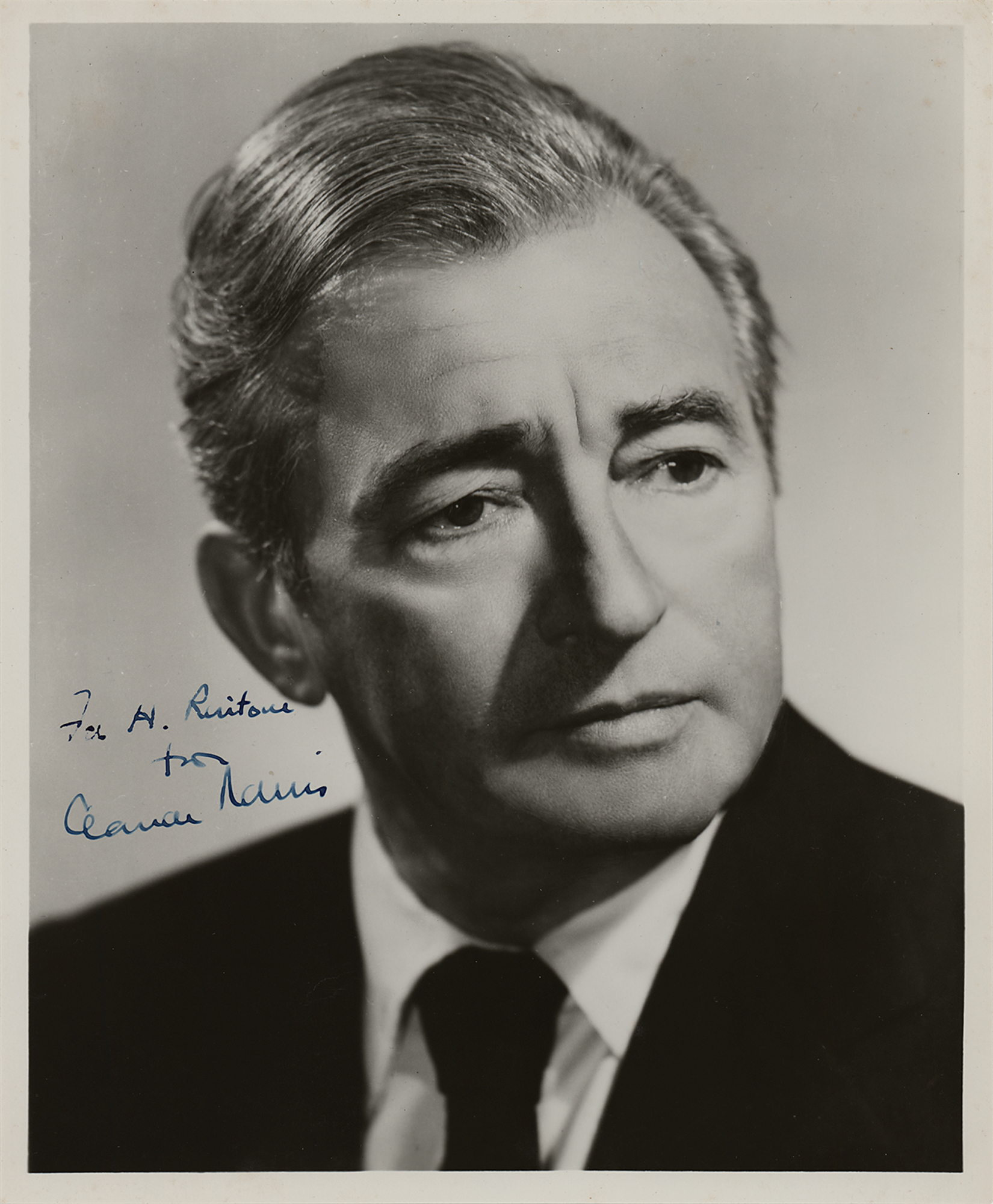 Celebrated British character actor (1889-1967) known for his roles in The Invisible Man (1933), Mr. Smith Goes to Washington (1939), The Wolf Man (1941), Casablanca (1942), Notorious (1946), and Lawrence of Arabia (1962). Vintage glossy 7.75 x 9.5 head-and-shoulders photo of the celebrated actor, signed and inscribed in fountain pen, "For H. Rintoul from Claude Rains." In very good to fine condition, with scattered light scratches and surface impressions.