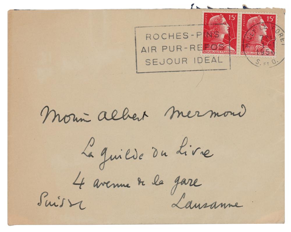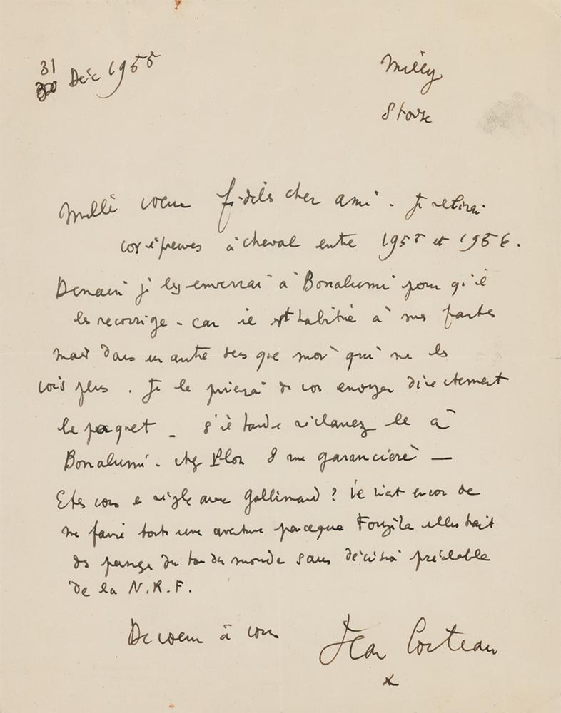 French poet, playwright, and film director (1889-1963) known for works such as the novel Les Enfants Terrible in 1929, and his film La Belle et la Bête in 1945. ALS in French, one page, 8.25 x 10.5, December 31, 1955. Untranslated handwritten letter to Albert Mermoud, founder of La Gilde du Livres. In fine condition. Accompanied by the original mailing envelope, addressed in Cocteau's hand.