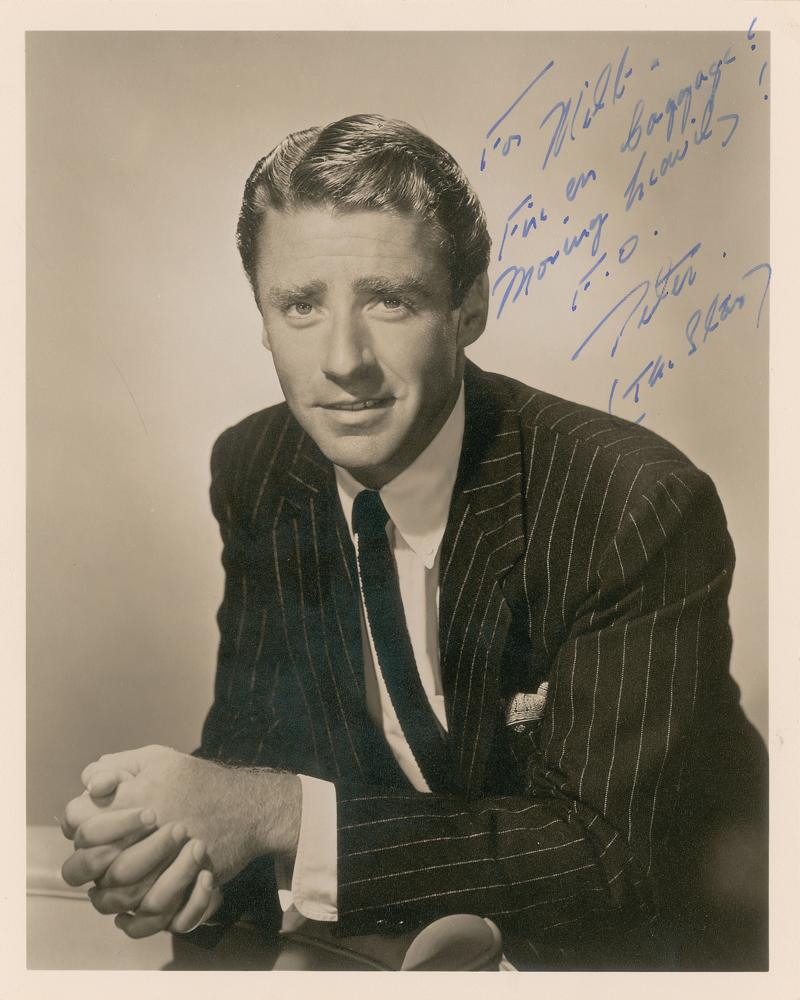 Handsome matte-finish 8 x 10 portrait of Lawford in a dashing pinstriped suit and tie, boldly signed and inscribed in fountain pen to his friend and manager Milton Ebbins, "For Milt—Fine on baggage! Moving heavily! F. O., Peter, (The Star)." In fine condition.