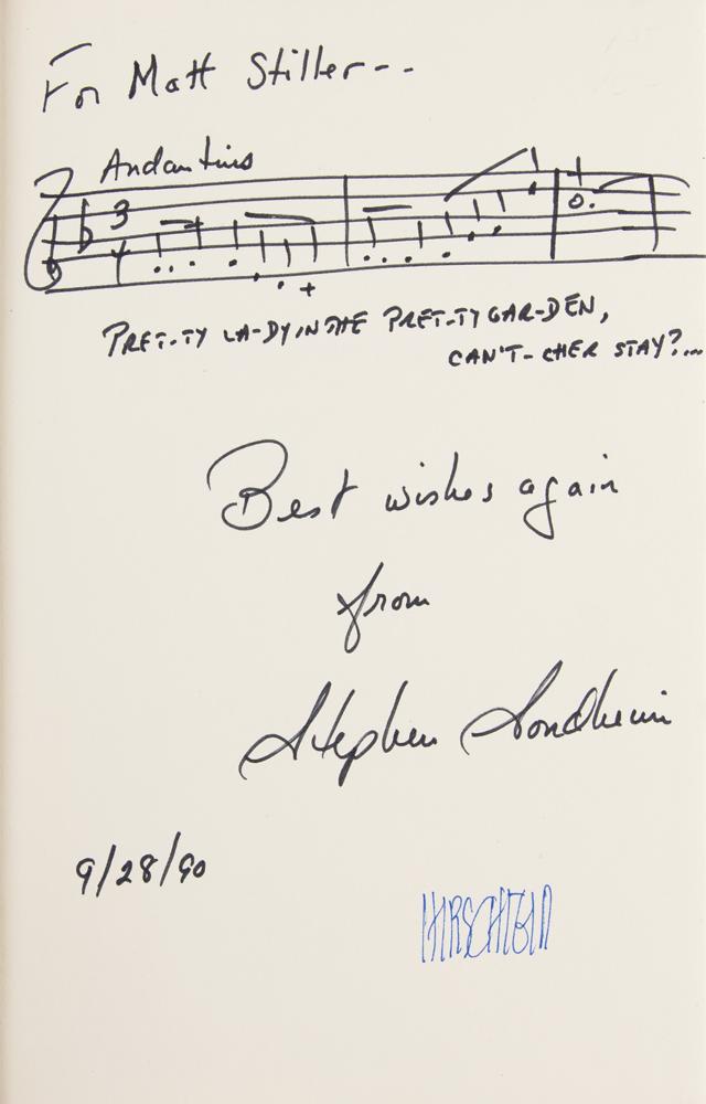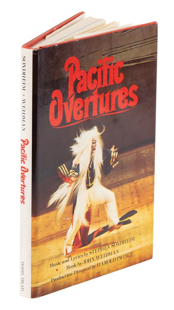 Sought-after signed book: Pacific Overtures. First edition. NY: Dodd, Mead & Company, 1977. Hardcover with dust jacket, 5.75 x 8.5, 128 pages. Desirably signed and inscribed on the first free end page in black felt tip, "For Matt Stiller—Best wishes again, from, Stephen Sondheim, 9/28/90," and in blue ink, "Hirschfeld," who provides the book's frontispiece illustration. Moreover, Sondheim has added three bars of music from the song 'Pretty Lady,' writing the tempo above, "Andantino," and some lyrics below, "Pret-ty la-dy in the pret-ty gar-den, can't-cher stay??" In fine condition. A unique item signed by two masters of their respective art form.