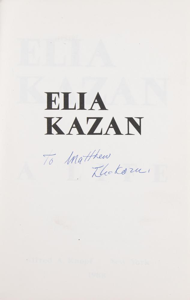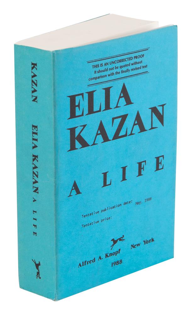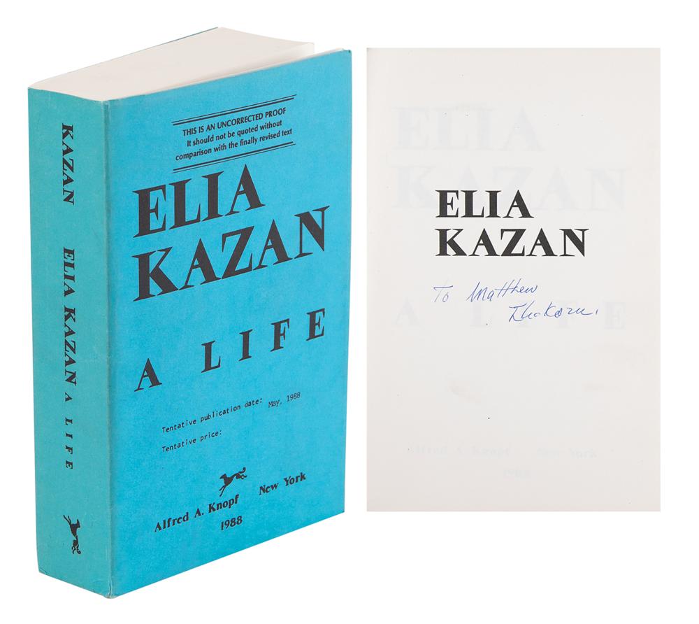 Uncommon signed book: Elia Kazan: A Life. First edition. NY: Alfred A. Knopf, 1988. An uncorrected proof copy with plain blue turquoise wrappers, 5.5 x 8.25, 816 pages. Signed and inscribed on the half-title page in blue ballpoint, "To Matthew, Elia Kazan." In fine, unread condition, with light sunning to the spine. A decidedly rare proof copy of Kazan's autobiography.
