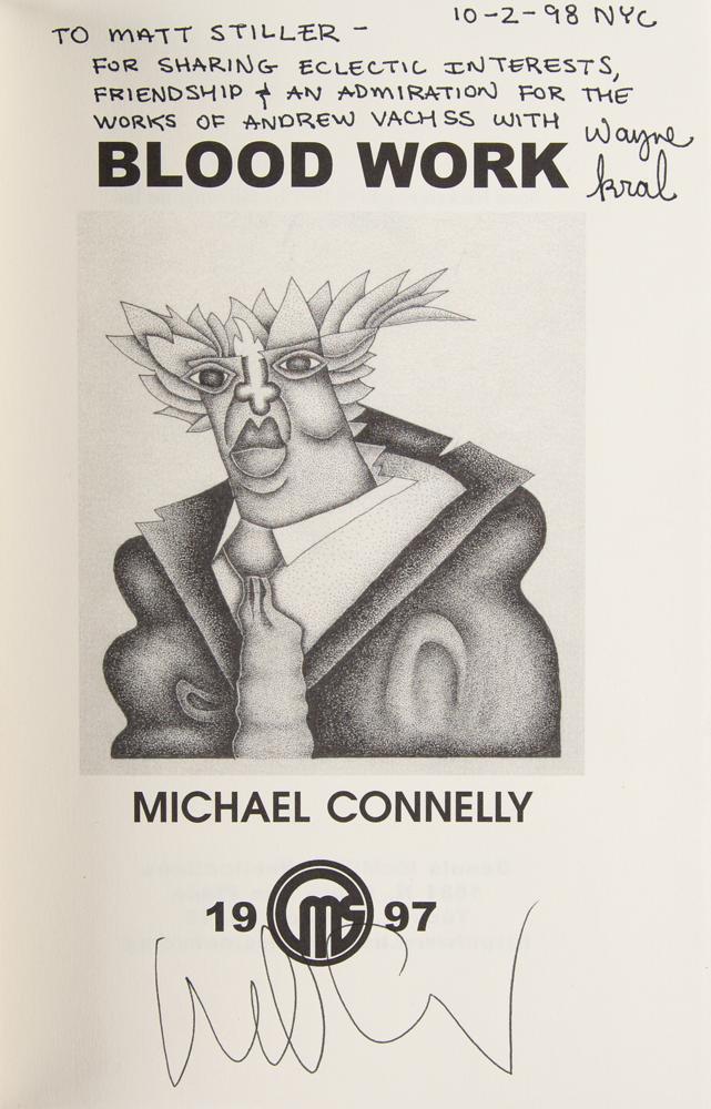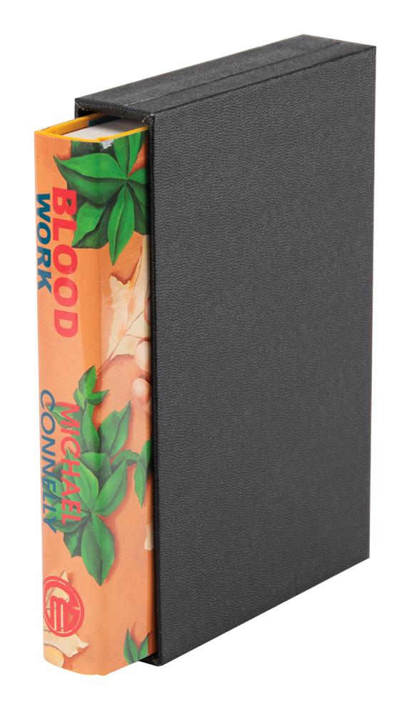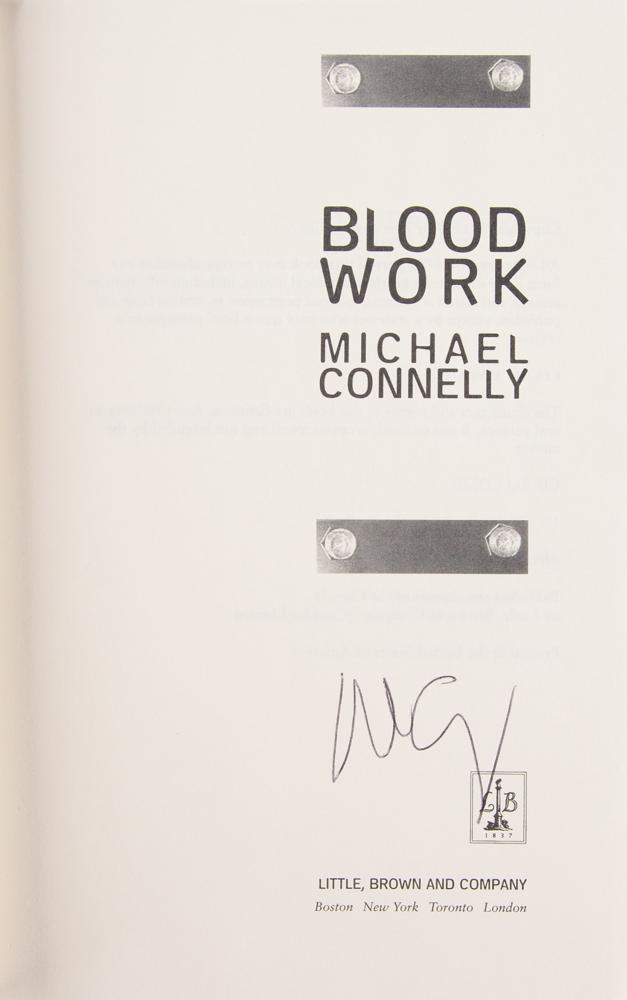 Two rare signed first edition books of Michael Connelly’s 1997 novel Blood Work—a special advance reading copy published by Little, Brown and Company, softcover with pictorial wrappers, signed on the title page in black ballpoint by Connelly; and a limited edition copy published by Dennis McMillan Publications, hardcover with dust jacket and slipcase, signed on the title page in black ink by Connelly and by the cover illustrator, Wayne Kral. In overall fine to very fine condition.