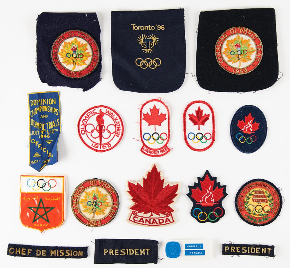 A rare and impressive collection of 17 pins and patches from the collection of longtime International Olympic Committee member James Worrall. The pins and patches range in size from 3 x 1.25 to 5 x 5.5 and were neatly removed from Worrall’s IOC suits following the article’s respective event or ceremony; some patches remain affixed to their original fabric swatches. Dating between 1948 and 1996, the pins and patches represent IOC events, Olympic trials, the Canadian Olympic Teams of 1960 and 1964, Toronto’s unsuccessful bid for the 1996 Summer Games, and more. Most notable are three gold-wire bullion patches from Worrall’s tenure with the Canadian Olympic Committee, with two marked “President” and one marked “Chef de Mission.” In overall fine condition.