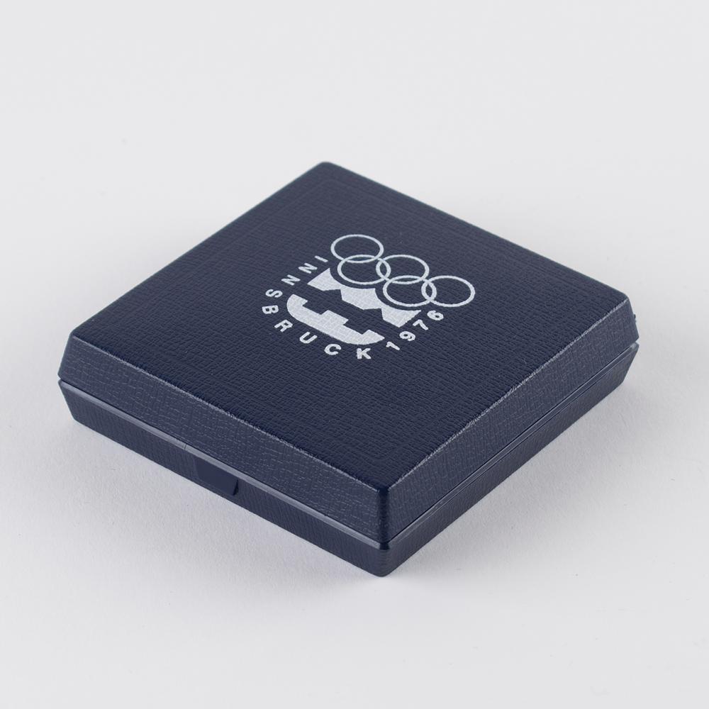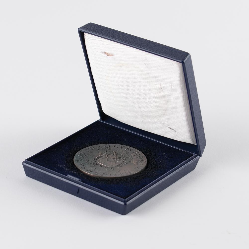 From the collection of longtime IOC member James Worrall— a participation medal issued for the Innsbruck 1976 Winter Olympics. Silvered bronze, 50 mm, 32 gm, by W. Pichl. The front depicts the Innsbruck Olympic emblem on ice crystals surrounded by text, "XII Olympische Winterspiele"; the reverse portrays the Bergisel ski jump with a panorama of Innsbruck and the Austrian Alps in the background. The medal bears noticeable pitting with evidence of verdigris to the reverse. Includes its rare original plastic presentation case.