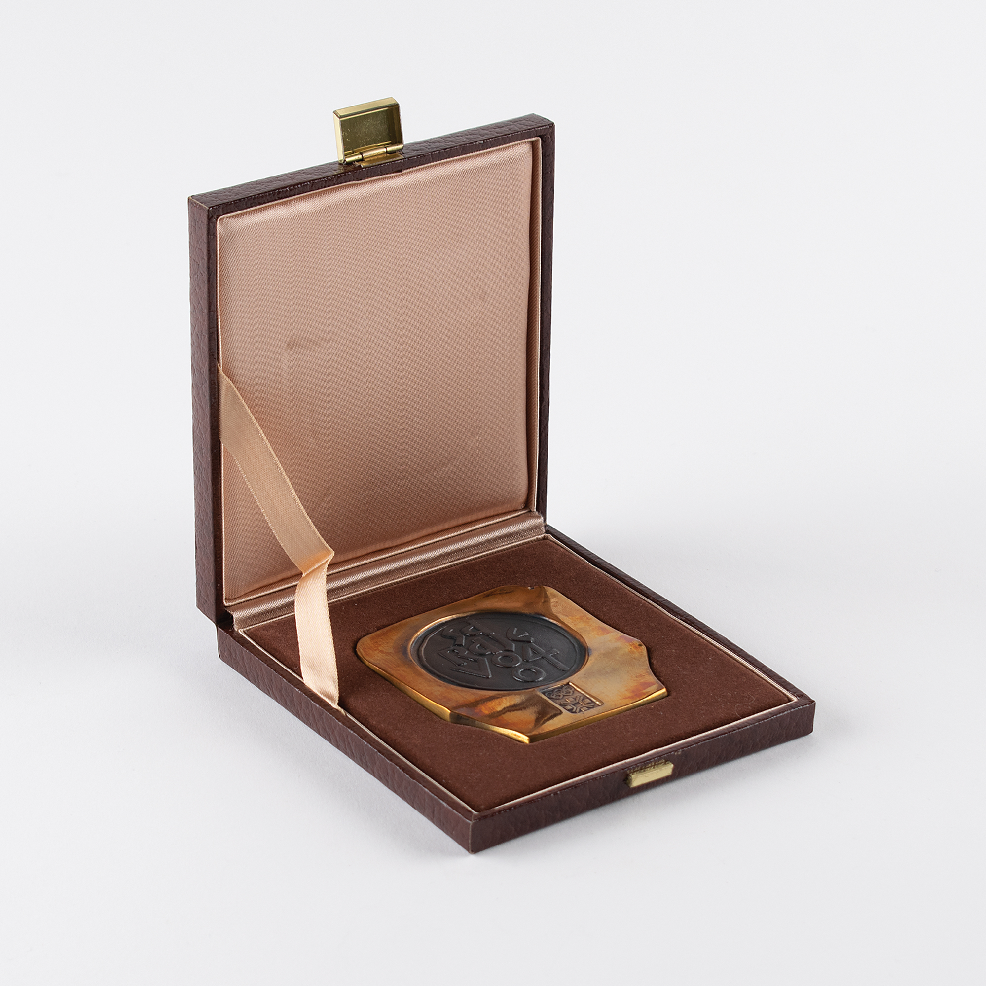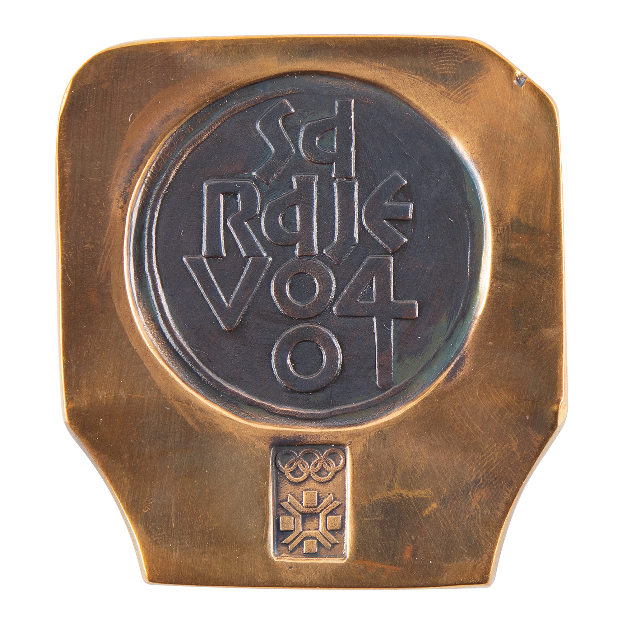From the collection of longtime IOC member James Worrall—a lovely participation medal issued for the Sarajevo 1984 Winter Olympics. Bronze, 60 mm x 65 mm, 129 gm, designed by Nebojsa Mitric. The front bears stylized raised text within a circle, “Sarajevo 84,” above the Olympic rings and logo; the reverse is plain with the monogram of the designer. These smaller-sized participation medals were bestowed to athletes and officials, while the large or medium examples were presented to dignitaries and officials, all of which have become increasingly sought-after by collectors. Includes its rare original brown leather case.