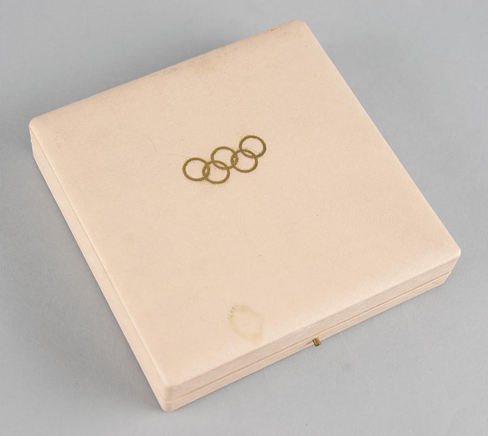 From the collection of longtime IOC member James Worrall—a scarce painted porcelain medallion from the Melbourne 1956 Summer Games made by Meissen, 89 mm in diameter, with embossed Olympic rings and motto on one side and the other featuring an olive crown with raised text, “Melbourne 1956, Gesamtdeutsche Olympiamannschaft,” with crossed swords mark below. Includes its original presentation box, which bears some stains and soiling. In fine condition.