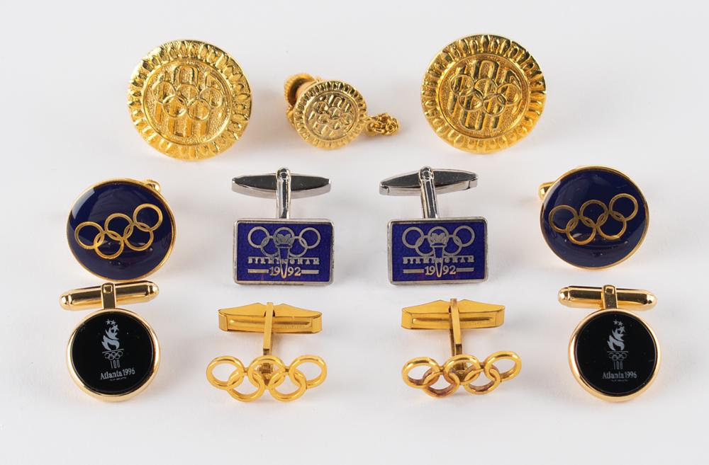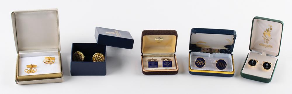 Group lot of five pairs of commemorative Olympic cufflinks from the personal collection of longtime International Olympic Committee member James Worrall. The cufflinks feature the following designs: the emblem for Birmingham’s bid for the 1992 Summer Games; the emblem for the Atlanta 1996 Summer Olympics; golden Olympic rings, with compliments sheet from the Los Angeles 1976 Olympic Committee; golden Olympics rings against blue enamel; and golden Olympic rings over “IOA.” Include some of the original boxes. In overall fine condition, with some wear to the boxes.