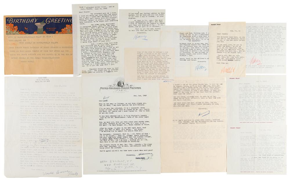 Prolific American songwriter (1895-1974) whose works, many of which were prominently featured in the films of the Marx Brothers and Eddie Cantor, include such standards as 'I Wanna Be Loved by You' and 'Three Little Words.' Group of ten TLSs by Harry Ruby, most signed "Harry," totaling seventeen pages on eleven sheets, dated from 1948 to 1972. Ruby writes on records, relationships, and the music business. Selected excerpts: