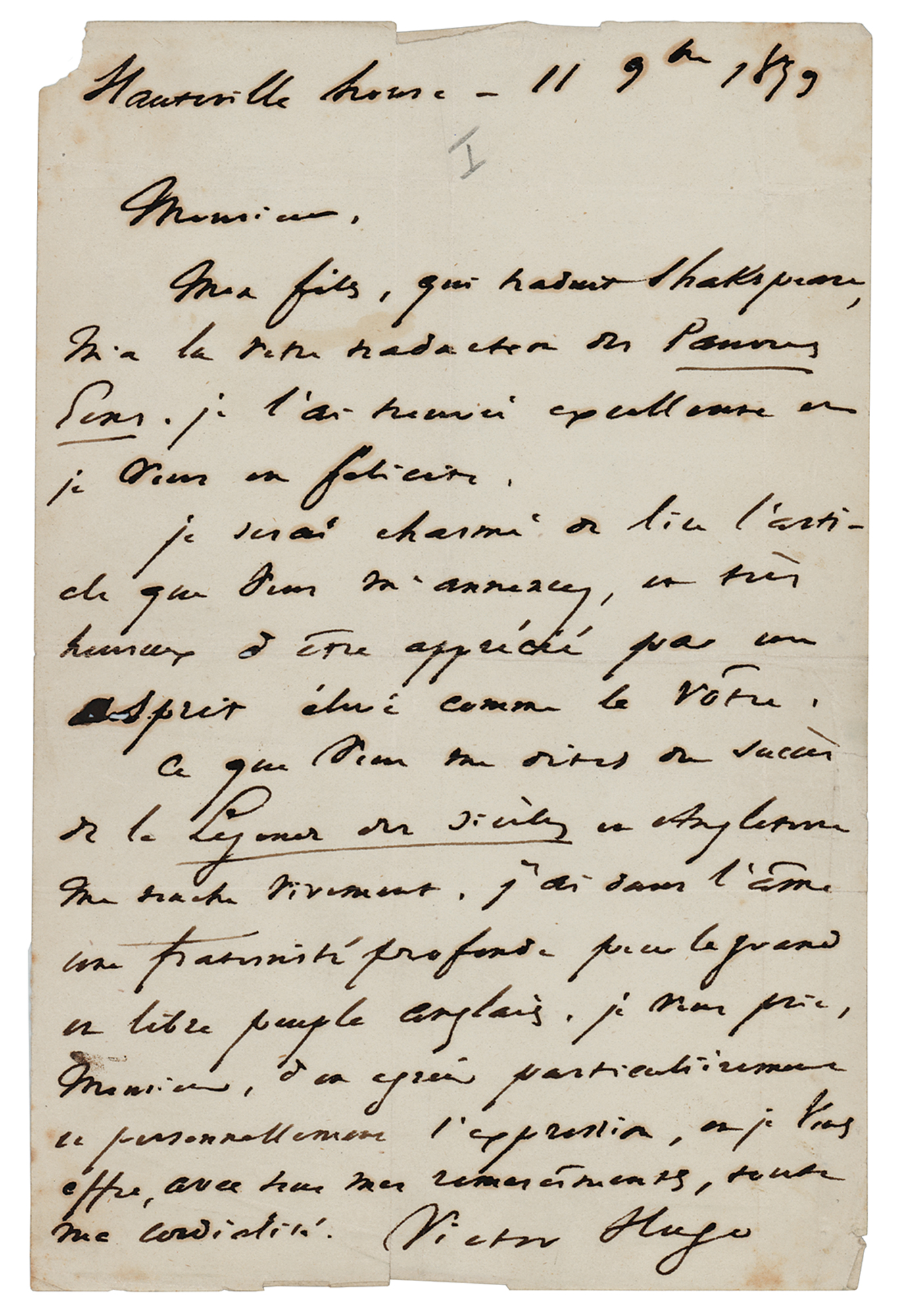 ALS, one page, 4.75 x 7.25, November 11, 1859. Handwritten letter from Hauteville House, the Guernsey mansion where he lived during his exile from France. In full (translated): "My son, who translates Shakespeare, has read to me your translation of ‘The Poor People.’ I found it excellent and congratulate you for it. I will be quite pleased to read the article which you are announcing to me, and very happy to be understood and liked by a high intelligence such as yours. What you tell me about the success of ‘The Legend of the Ages’ in England moves me greatly. I have in my soul a deep feeling of brotherhood for the great and free English people. I beg your, Sir, to specially and personally accept the expression of this feeling, and I offer you all my thanks and cordiality." In fine condition, with some minor edge wear.