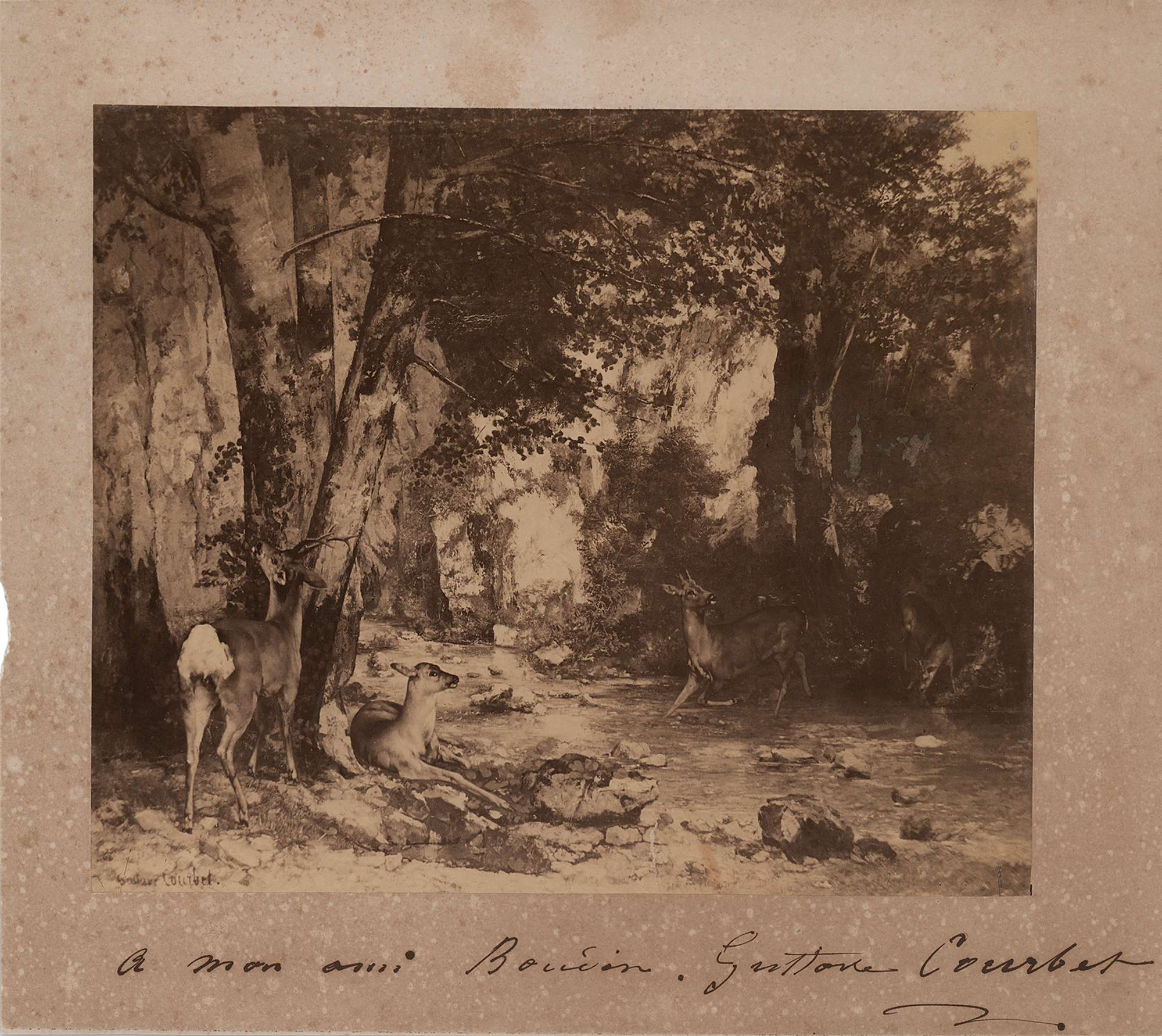 French painter (1819-1877) who led the Realism movement and was scorned for his rigid classical outlook. He was imprisoned and fined for his part in the destruction of the Vendome Column and later fled to Switzerland. Scarce 9.25 x 7.75 albumen photo of his painting 'A Thicket of Deer at the Stream of Plaisir-Fountaine' ['Remise de chevreuils au ruisseau de Plaisir-Fontaine,' now at Musée d’Orsay], affixed to its original 11.5 x 10.25 mount, signed and inscribed on the mount in bold ink to his friend and fellow painter Eugène Boudin, "A mon ami Boudin, Gustave Courbet.” In fine condition, with lightly speckled staining to the mount. A stunning testimony to the friendship between two of the most prominent French painters of the 19th century.