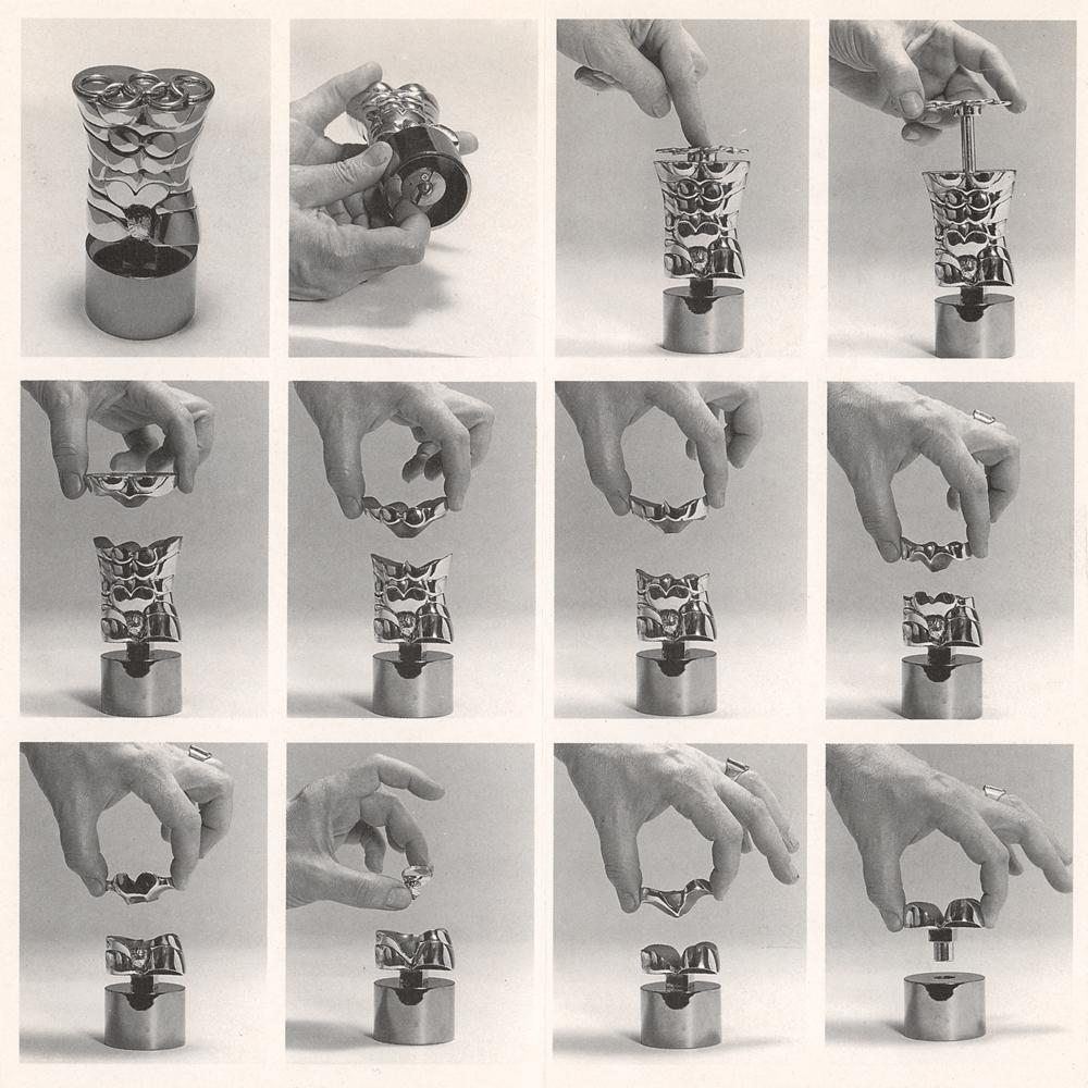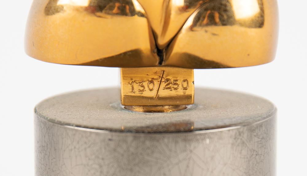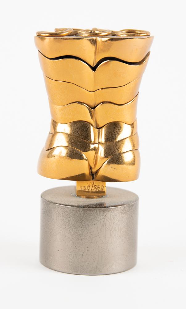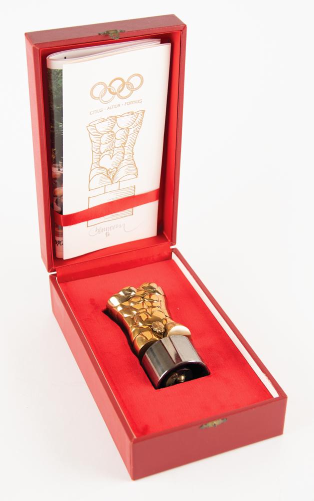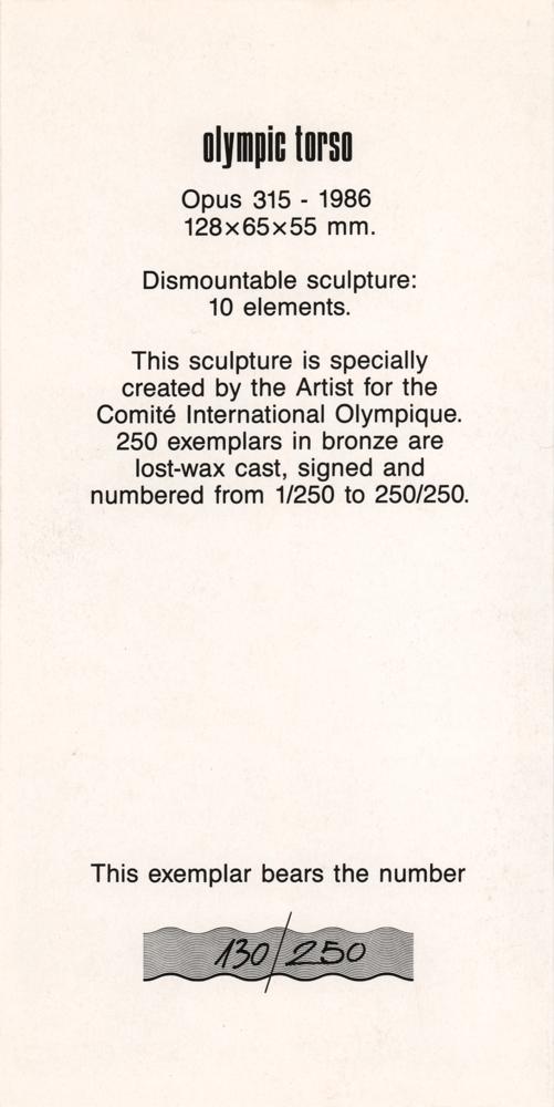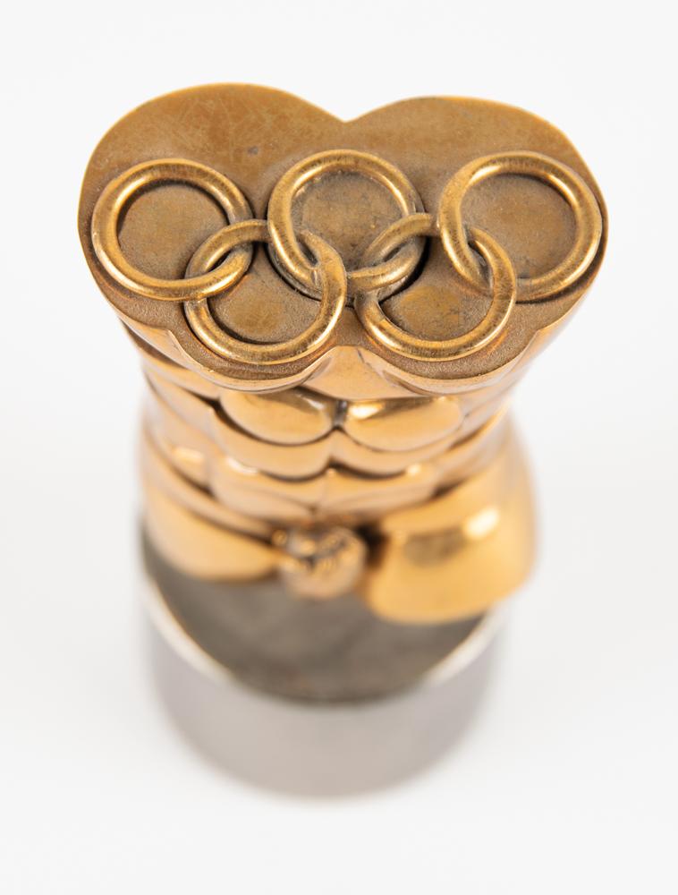 Limited edition ‘Olympic Torso’ bronze puzzle sculpture that was presented to Canadian Olympic administrator James Worrall in 1986. Designed by Spanish artist Miguel Berrocal, the statuette, numbered 130/250, 127 mm in height and 55 mm in diameter, features an abstract multilayered male torso with the uppermost section topped with the Olympic rings. The lower portion is engraved with the artist's name. Completed with the original presentation case, signed pamphlet, and certificate of authenticity, which states: “This sculpture is specially created by the Artist for the Comite International Olympique. 250 exemplars in bronze are lost-wax cast, signed and numbered from 1/250 to 250/250.” The case bears some light wear and marks.