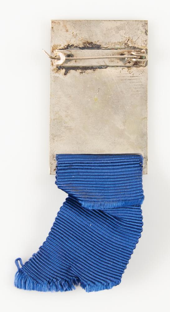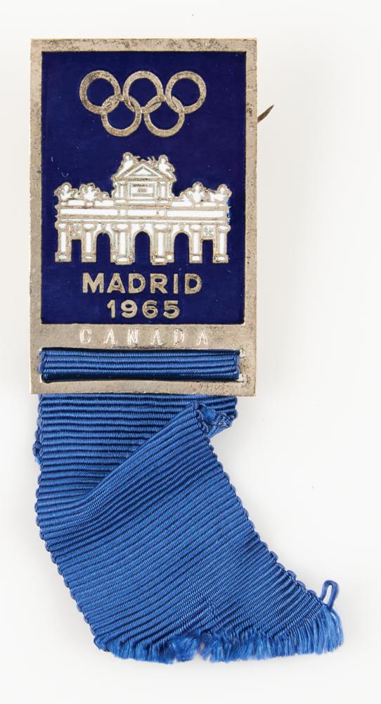 From the collection of longtime IOC member James Worrall—a badge from the 63rd International Olympic Committee session held in Madrid, Spain, in 1965, measuring 32 mm x 50 mm, with a blue, white, and silver enameled design of the Olympic rings over the Puerta de Alcalá, reading, "Madrid 1965," with "Canada" engraved below. Complete with its navy blue ribbon.