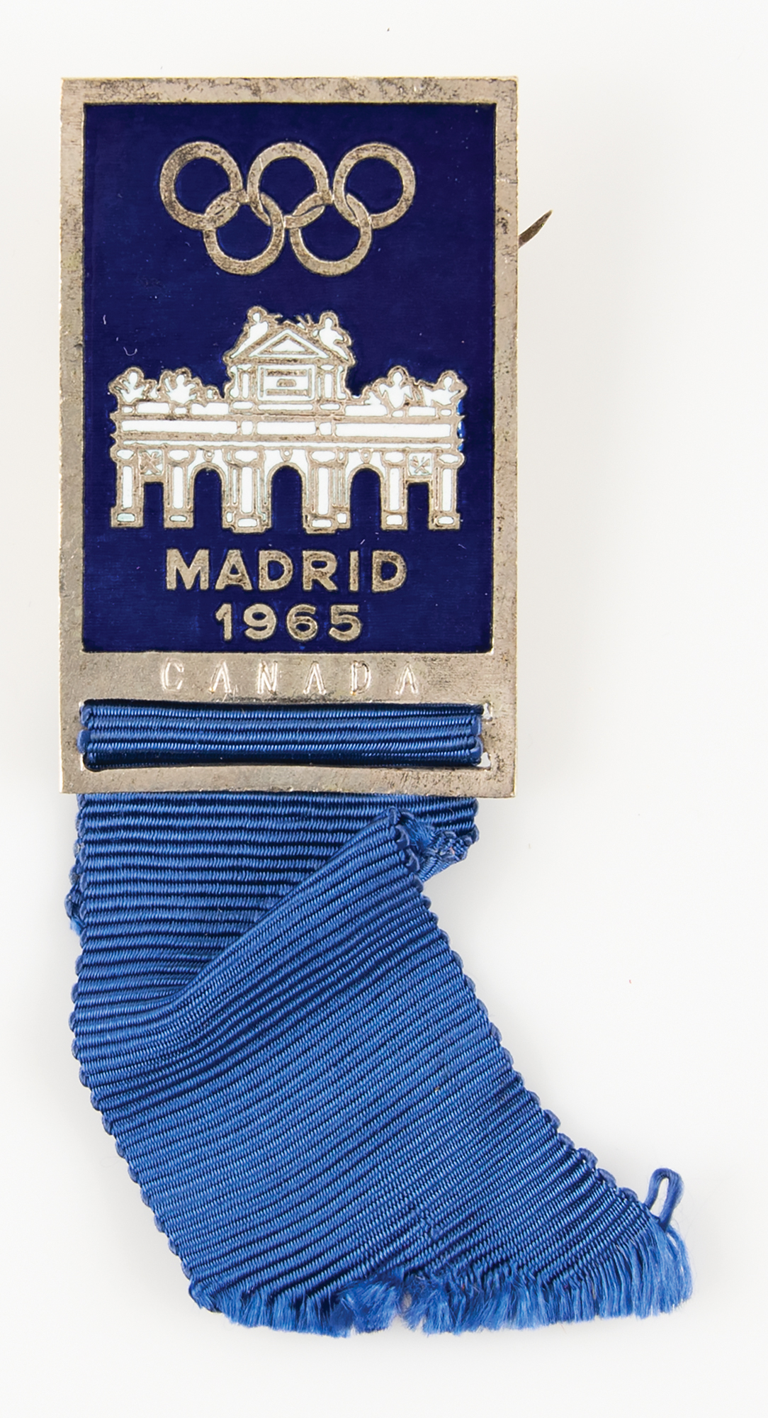 From the collection of longtime IOC member James Worrall—a badge from the 63rd International Olympic Committee session held in Madrid, Spain, in 1965, measuring 32 mm x 50 mm, with a blue, white, and silver enameled design of the Olympic rings over the Puerta de Alcalá, reading, "Madrid 1965," with "Canada" engraved below. Complete with its navy blue ribbon.