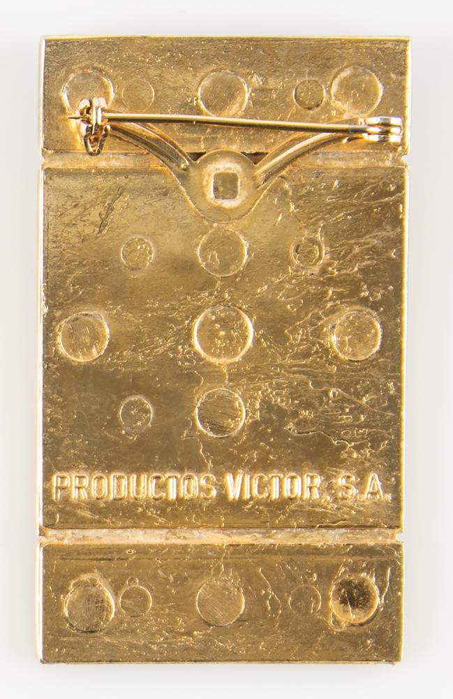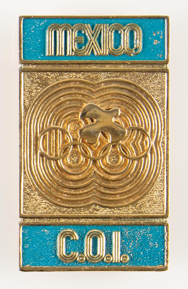 From the collection of longtime IOC member James Worrall—a rare badge for the 67th IOC Session, which was held during the Mexico 1968 Summer Olympics. The gold-tone badge, 38 mm x 64 mm, 32 gm, features the raised logo for the XIX Olympiad between two blue enamel bars with gilt text: “Mexico” and “C.O.I.” The reverse is marked as “Productos Victor, S.A.” The ribbon is not present. At the 67th IOC Session, Avery Brundage was re-elected as the President of the International Olympic Committee for the fourth term.