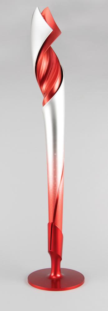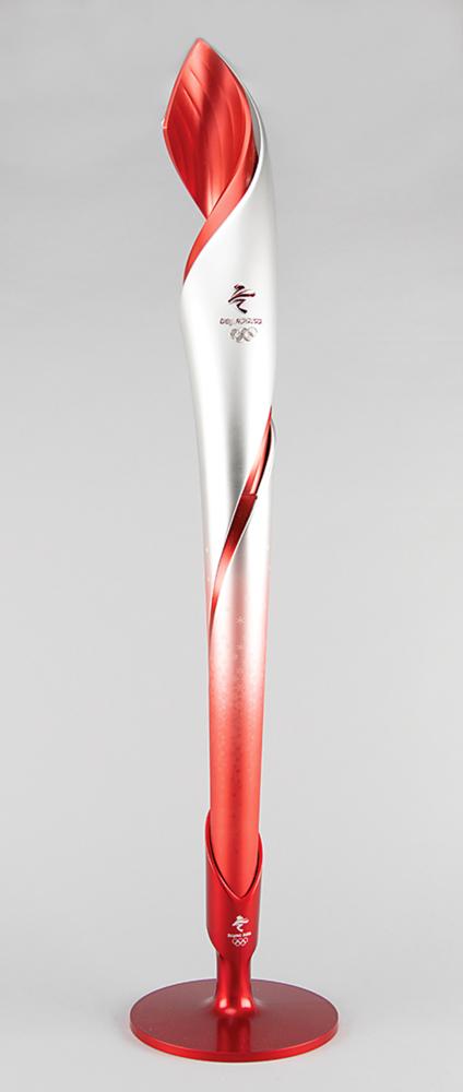 Official 2022 Beijing Winter Olympics torch, constructed of a resin-coated carbon fiber composite, measuring 33" in length and 4" at its widest point. Manufactured by Sinopec Shanghai Petrochemical Company and designed by Li Jianye and his team, the torch was inspired by the natural flowing beauty of plants and flowers, a theme that meshed with Beijing’s green approach to the torch’s materials and combustion fuel—carbon fiber composite, a new material made of petroleum products, and hydrogen gas, a special fuel that proved both smoke-free and environmental-friendly. The flora-like spiral construction resulted in a floating ribbon look, and its beautiful replication of movement led to its being given the name ‘Flying’ [Fei Yang]. The torch utilizes an open design with a stunning red and silver color scheme, a metaphor for ice and fire, meant to symbolize how the torch will bring 'light and warmth to this world of ice and snow’—this color combination, and even the torch’s design, relates to its 2008 predecessor and ceremonial cauldron.