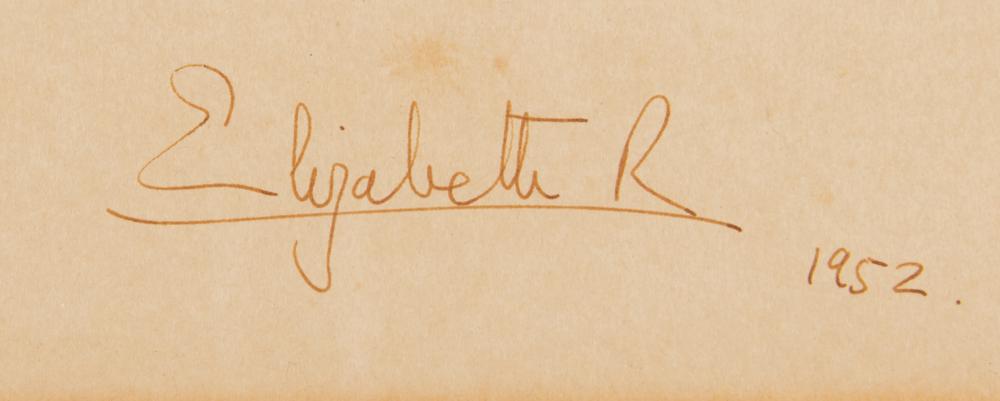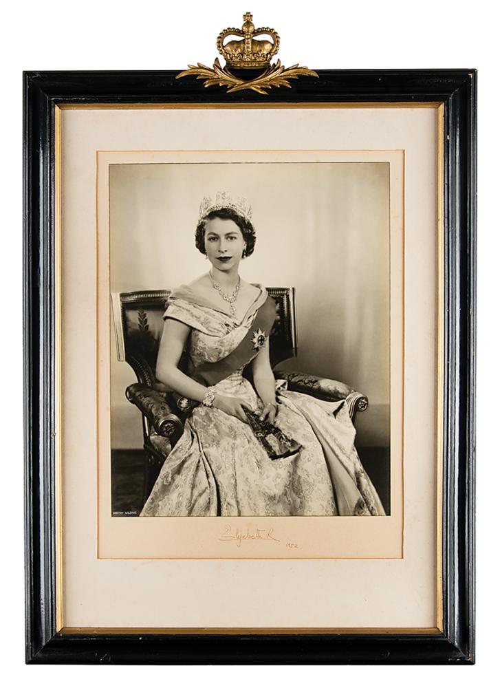 Extraordinary oversized vintage matte-finish 13.75 x 17.25 portrait of Queen Elizabeth II seated and wearing her glimmering crown jewels by Royal Court photographer Dorothy Wilding, affixed to its original 15 x 20 mount, which is signed in fountain pen in the first year of her reign, "Elizabeth R, 1952." Strikingly matted and framed by Chapman Brothers/Royal Art Frames to an overall size of 22.25 x 32, with a royal crown at the top; the original glass has been replaced with TruVue conservation glass. In fine condition. A gorgeous portrait of the newly crowned queen, beautifully presented in its ornate original frame.