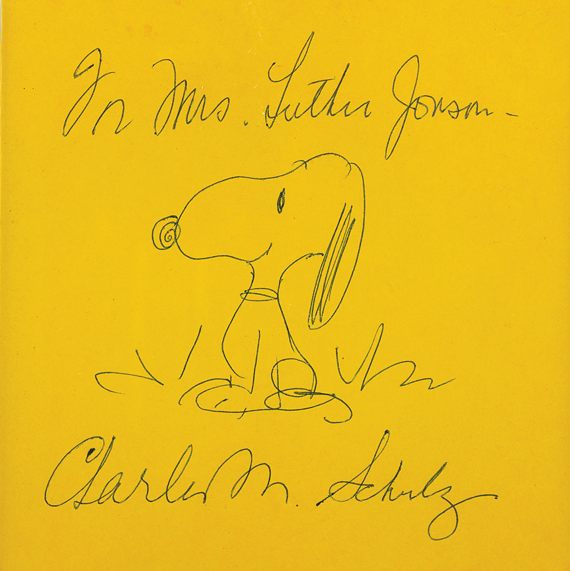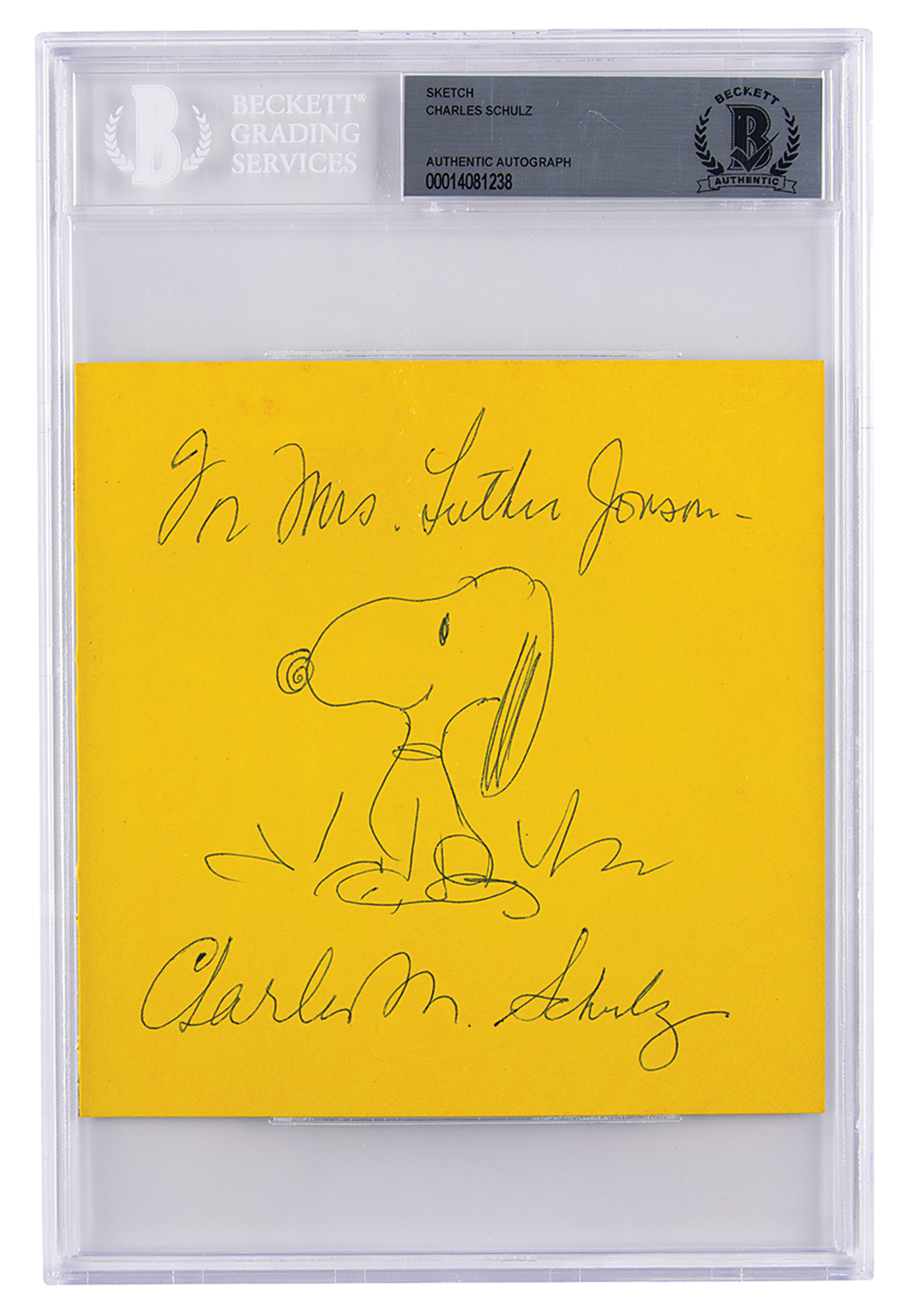 Original vintage ballpoint sketch of Snoopy accomplished by the Peanuts creator on a yellow 5.25 x 5.5 card, signed and inscribed in blue ballpoint, "For Mrs. Luther Jonson, Charles M. Schulz." In fine condition. Encapsulated in a Beckett authentication holder. A wonderful sketch of the iconic cartoon character.