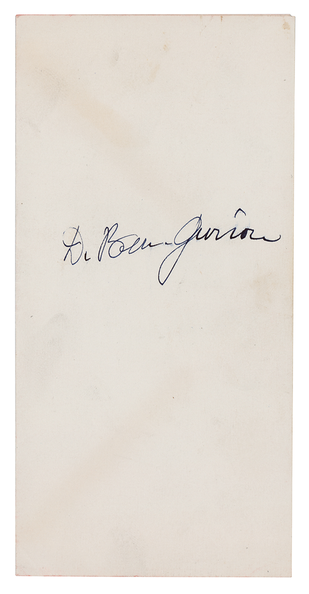 Vintage fountain pen signature, "D. Ben-Gurion,” on an off-white 3.25 x 6.5 slip. In fine condition, with some faint envelope-related toning. Accompanied by the original mailing envelope (postmarked 1969) and a full letter of authenticity from JSA.