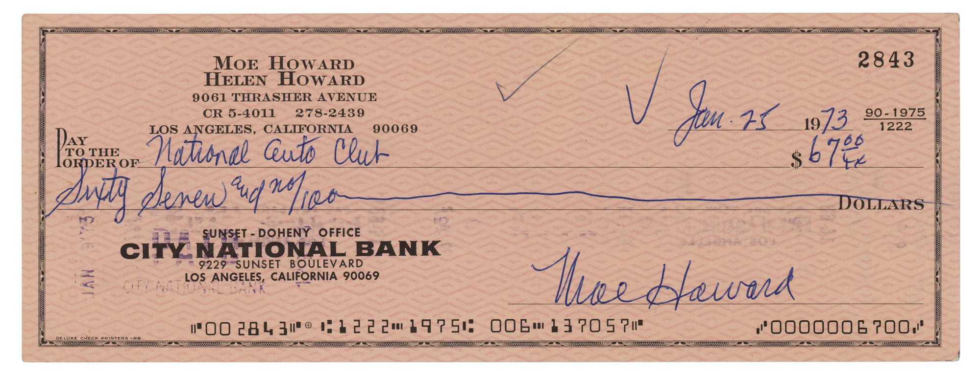 Personal check, 8.25 x 3, filled out and signed by Howard, "Moe Howard," payable to National Auto Club for $67, January 25, 1973. In fine condition. Accompanied by a full letter of authenticity from PSA/DNA.