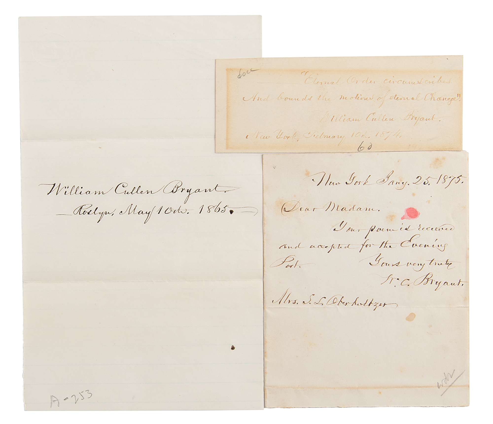 Three items signed by the romantic poet and journalist: a bold ink signature, "William Cullen Bryant, Roslyn, May 10th 1865," on an off-white 5 x 8 sheet; an AQS on an off-white 5 x 2 card: "'Eternal order circumscribes and bounds the motions of eternal change,' William Cullen Bryant, New York, February 10th 1874"; and an ALS signed "W. C. Bryant," one page, 4 x 5.25, January 25, 1875, in full: "Your poem is received and accepted for the Evening Post." In overall very good to fine condition, with toning to the AQS and scattered staining to the letter.