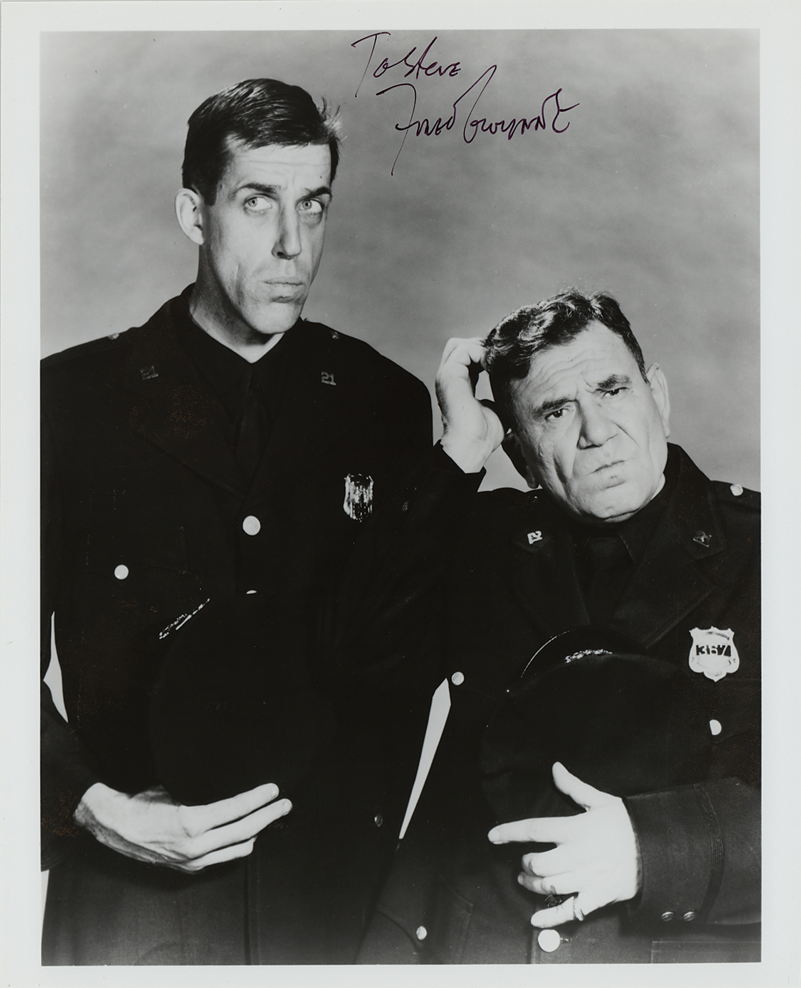 Scarce glossy 8 x 9.75 photo of Fred Gwynne as Francis Muldoon and Joe E. Ross as Gunther Toody from the sitcom Car 54, Where Are You?, signed and inscribed in thin black felt tip, "To Steve, Fred Gwynne.” In fine condition.