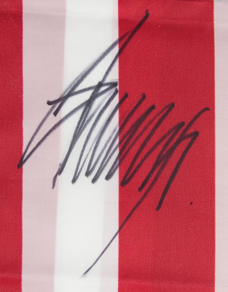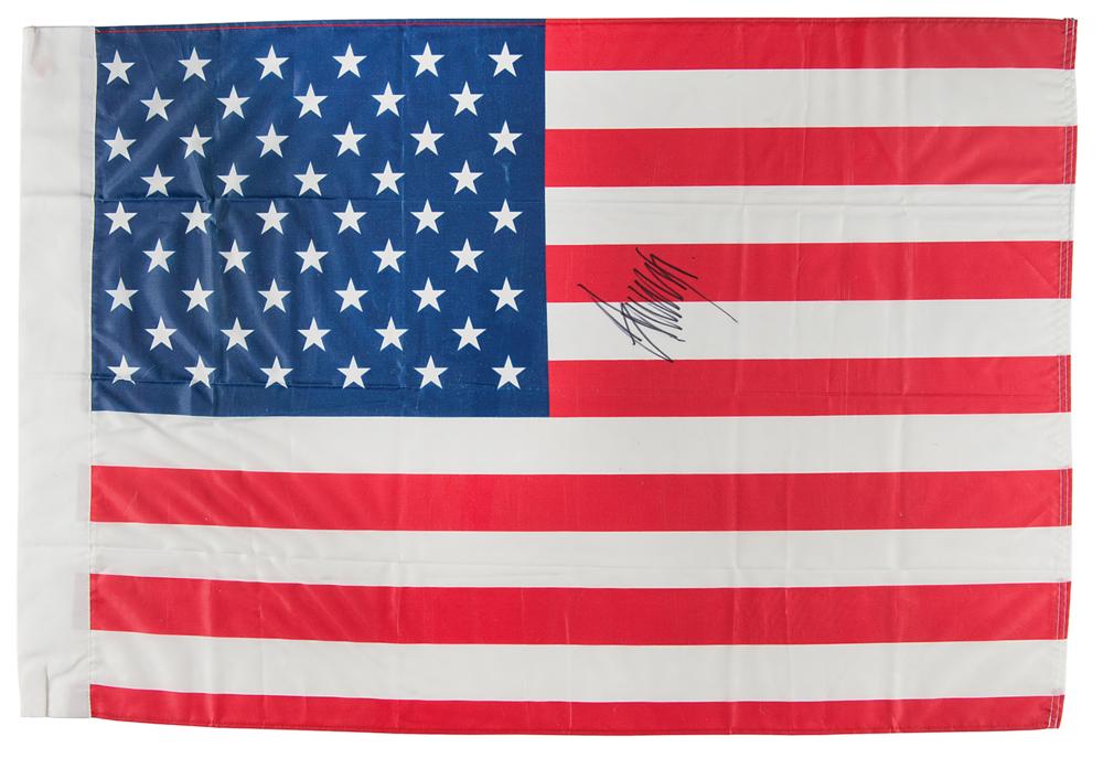 Desirable 27.5″ x 40.5″ nylon American flag by Annin & Co., signed at center in black felt tip by Donald Trump. Folded and in very fine condition.