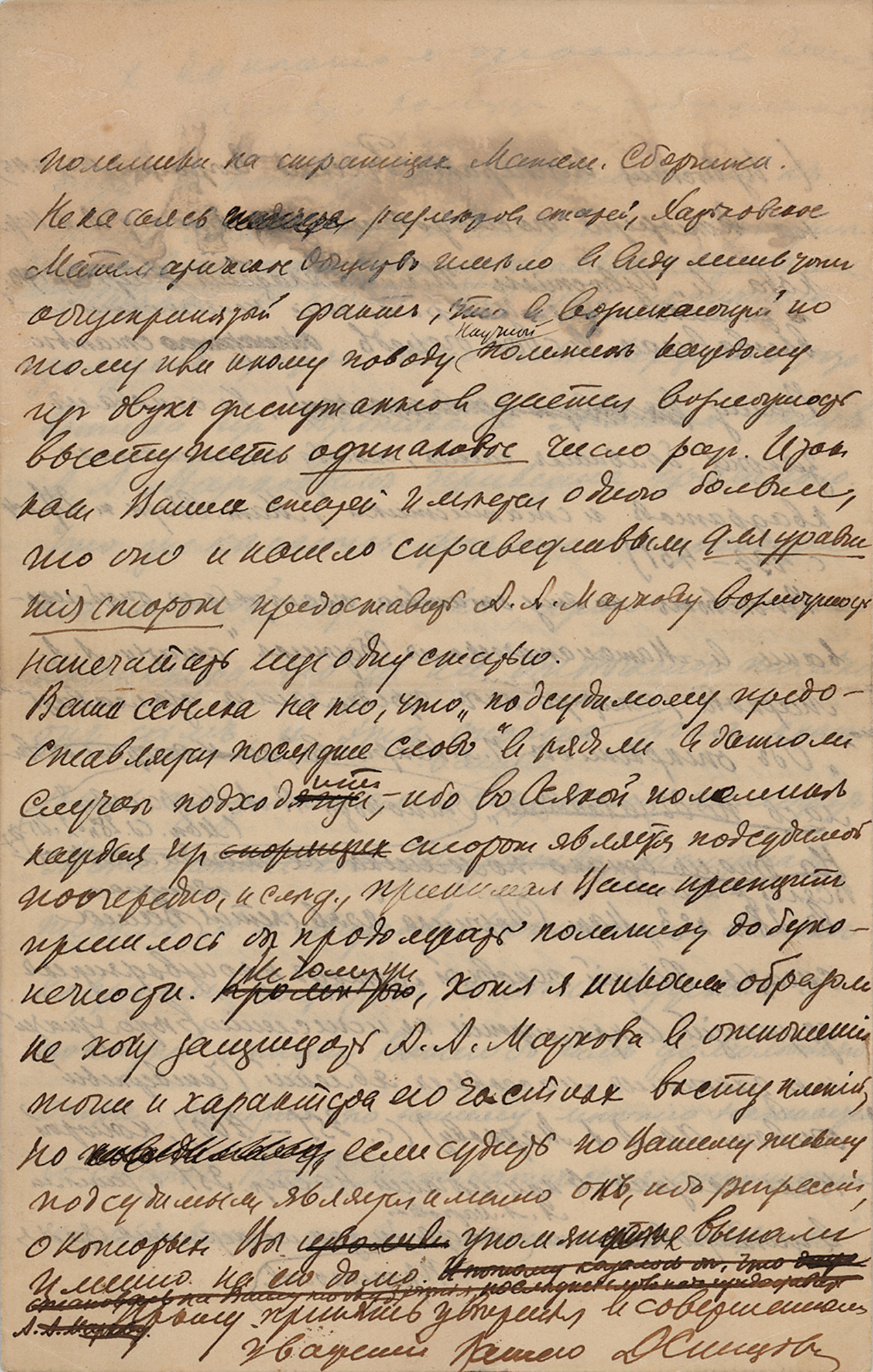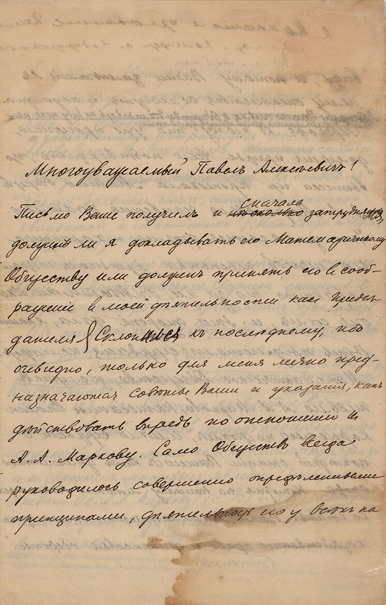 In response to this article, an article by A. A. Markov was published in the Mathematical Collection, which he intended to title 'On the discoveries of P. A. Nekrasov,' but which appeared under the title 'Reply to P. A. Nekrasov.' On this, however, the controversy ended, and in vol. 28 'Mat. Collection' appears your extensive article 'The general basic method of generating functions as applied to calculus?to the laws of mass phenomena?answer to academician A. A. Markov' (p. 351-460), which, as stated in the note on p. 351?in quoting Markov and?this article is a polemic on the pages of Mat. Collection?Your reference to the fact that 'the defendant is given the last word' is hardly suitable in this case, because in any controversy, each of the parties is the defendant in turn, and so on?In addition, although I in no way want to defend A. A. Markov in relation to the thought and nature of his private speeches, but judging by your letter, it is he who is the defendant, because the repressions you mention fell to his lot." In fine condition, with scattered dampstaining and adhesive residue to the upper half of the letter.