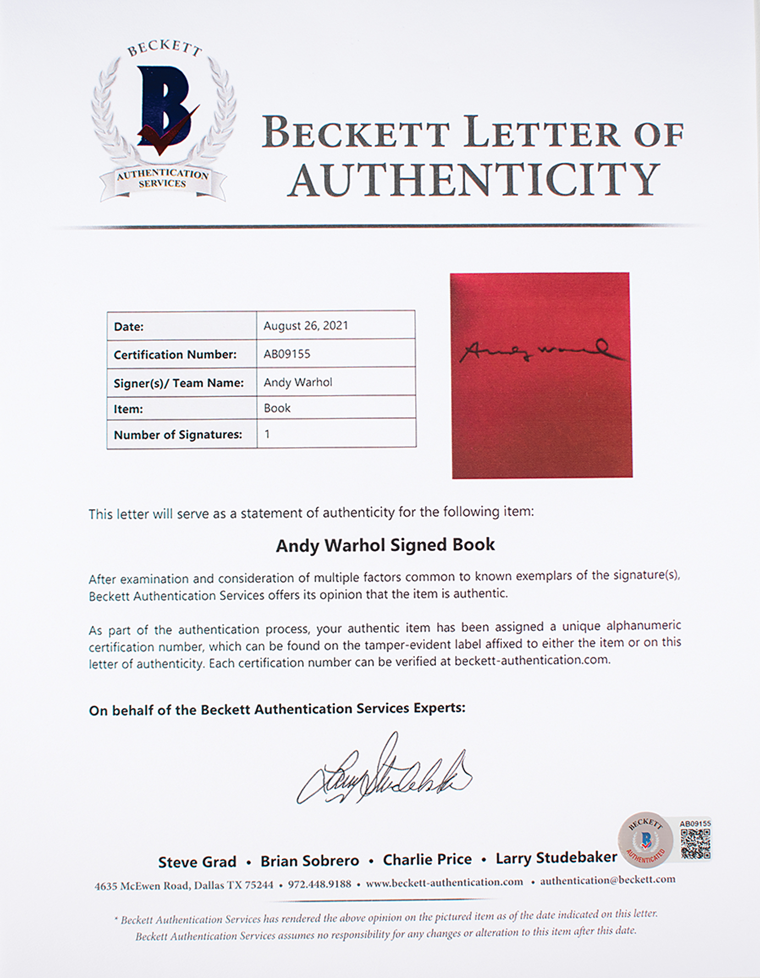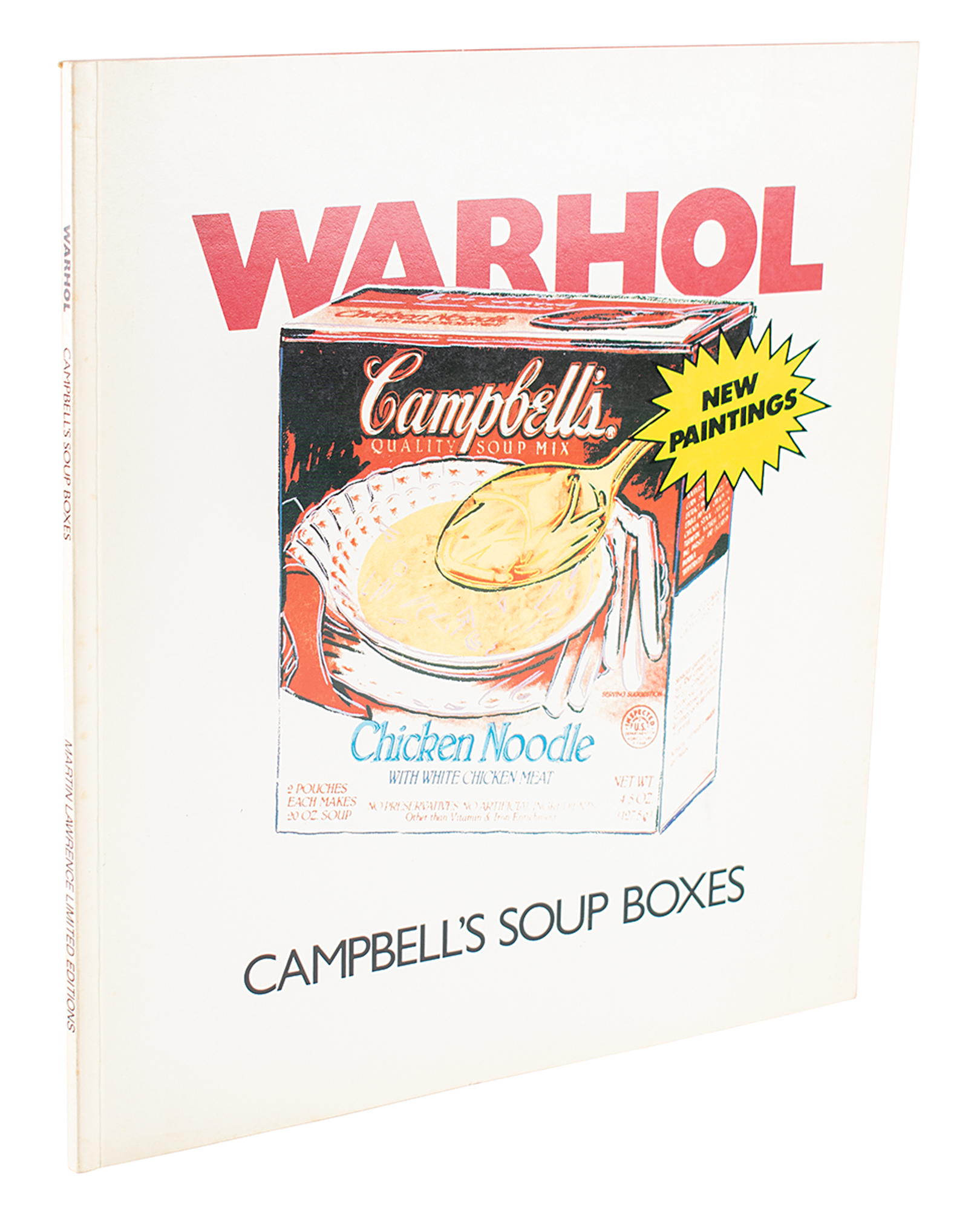Signed book: Warhol: Campbell's Soup Boxes. Los Angeles, California: Michael Kohn Gallery / Martin Lawrence Limited Editions, 1986. Paperback, 10 x 11, 36 pages. Signed prominently on the first free end page in black felt tip by Andy Warhol. In fine condition. Accompanied by a letter of authenticity from Beckett Authentication Services and by the original packing slip from Martin Lawrence Limited Editions.