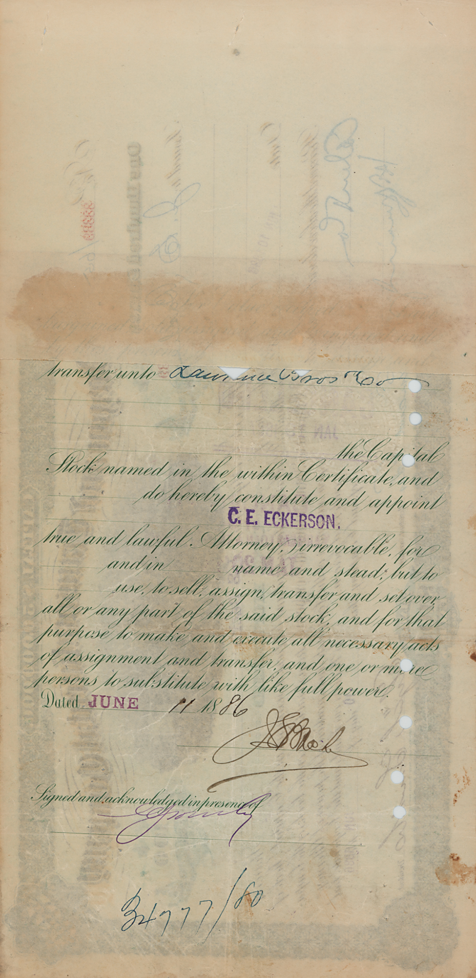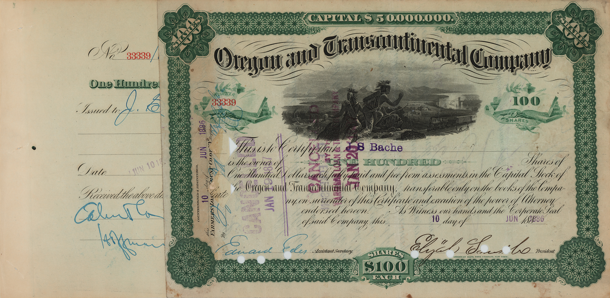 American banker, art collector, and philanthropist (1861-1944) whose stock brokerage firm, J. S. Bache & Co., was one of the top brokerage houses in the United States. Partly-printed DS, signed “J. S. Bache,” one page, 10.75 x 7, June 10, 1886. Stock certificate issued to J. S. Bache for 100 shares in the Oregon and Transcontinental Company, endorsed on the reverse by Bache to transfer the shares; the front is signed at the bottom by Elijah Smith as the company's president. The certificate boasts a handsome vignette of Native American Indians observing a train in a valley. The original receipt remains affixed to the left side. In fine condition.