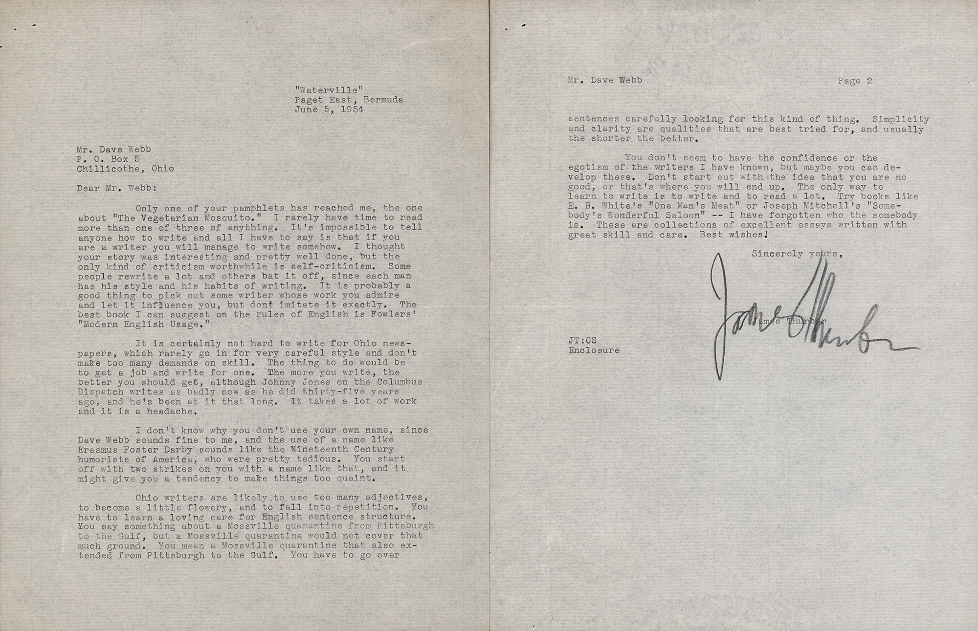 American humorist and author (1894-1961) best known for such stories as The Secret Life of Walter Mitty and for his distinctive, wittily captioned cartoon drawings published in the New Yorker. TLS, signed in pencil, two pages, 8.5 x 11, June 5, 1954. TLS signed in pencil “James Thurber,” one-and-a-half pages, 8.25 x 11, June 5, 1954. Letter sent from ‘Waterville’ in Paget East, Bermuda, addressed to aspiring writer Dave Webb, in part: “I rarely have time to read more than one of three of anything. It’s impossible to tell anyone how to write and all I have to say is that if you are a writer you will manage to write somehow. I thought your story was interesting and pretty well done, but the only kind of criticism worthwhile is self-criticism?It is certainly not hard to write for Ohio newspapers, which rarely go in for very careful style and don’t make too many demands on skill?Johnny Jones on the Columbus Dispatch writes as badly now as he died thirty-five years ago, and he’s been at it that long. It takes a lot of work and it is a headache. I don’t know why you don’t use your own name, since Dave Webb sounds fine to me, and the use of a name like Erasmus Foster Darby sounds like the Nineteenth Century humorists of America, who were pretty tedious. You start off with two strikes on you with a name like that?Ohio writers are likely to use too many adjectives, to become a little flowery, and to fall into repetition. You have to learn a loving care for English sentence structure?The only way to learn to write is to write and to read a lot. Try books like E. B. White’s ‘One Man’s Meat’ or Joseph Mitchell’s ‘Somebody’s Wonderful Saloon’—I have forgotten who the somebody is.” In very good to fine condition, with some creasing, heavier to the second page.