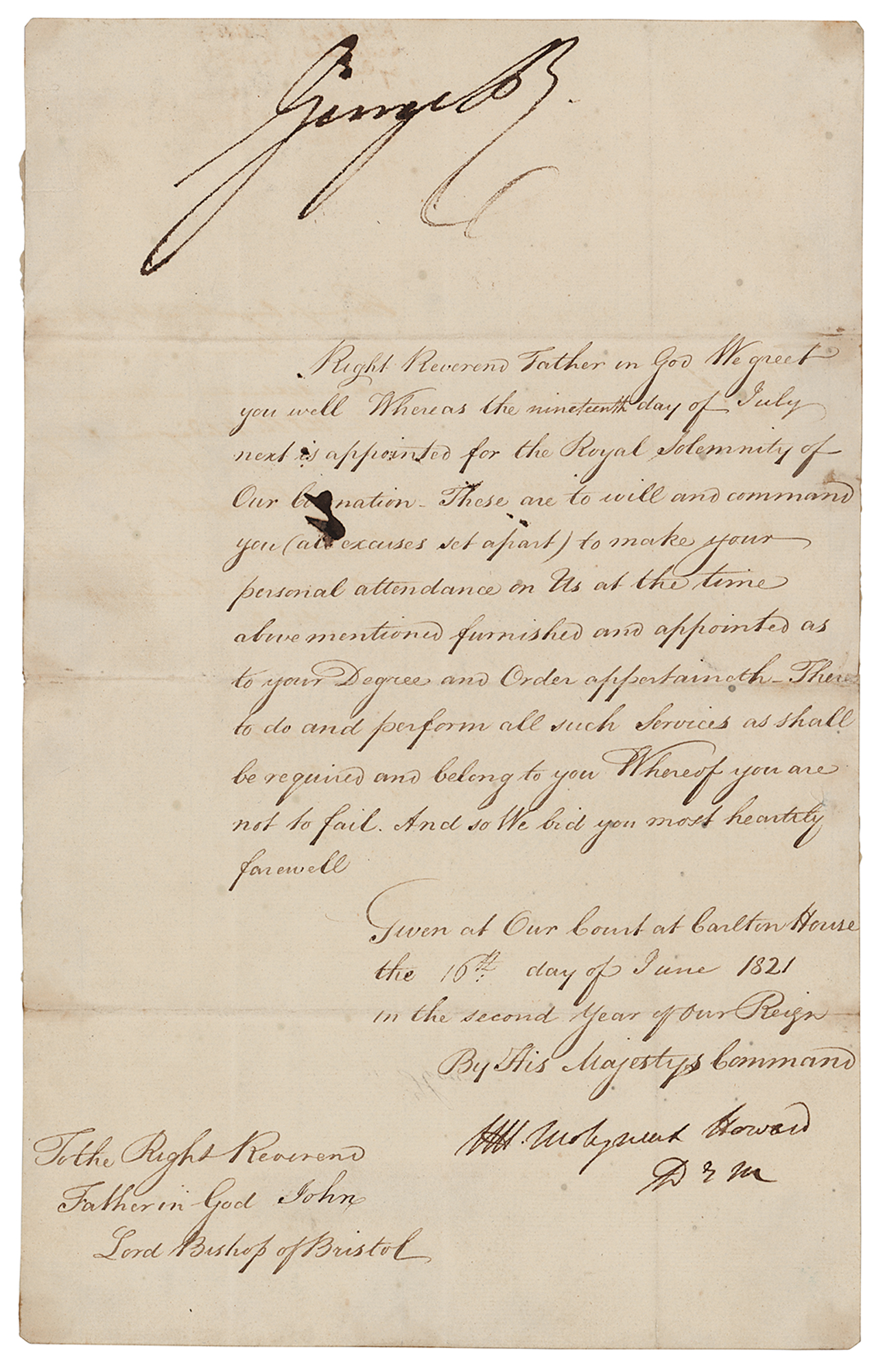 Exceptional manuscript DS, signed at the top “George R,” one page, 8 x 12.5, June 16, 1821. Given from Carlton House, a royal order document from King George IV commanding “John, Lord Bishop of Bristol,” to attend his coronation and perform his duties. In part: “Whereas the nineteenth day of July next is appointed for the Royal Solemnity of Our Coronation. These are to will and command you (all excuses set apart) to make your personal attendance on Us at the time above mentioned furnished? There to do and perform all such Services as shall be required and belong to you. Whereof you are not to fail.” Signed prominently in the upper margin by the king, and countersigned below by Lord Henry Thomas Howard-Molyneux-Howard as Deputy Earl Marshal (D.E.M.), who was tasked with planning out the Ecclesiastical portion of the coronation. In very good to fine condition, with a tear to the upper left edge, and light show-through from old mounting remnants on the back edges.