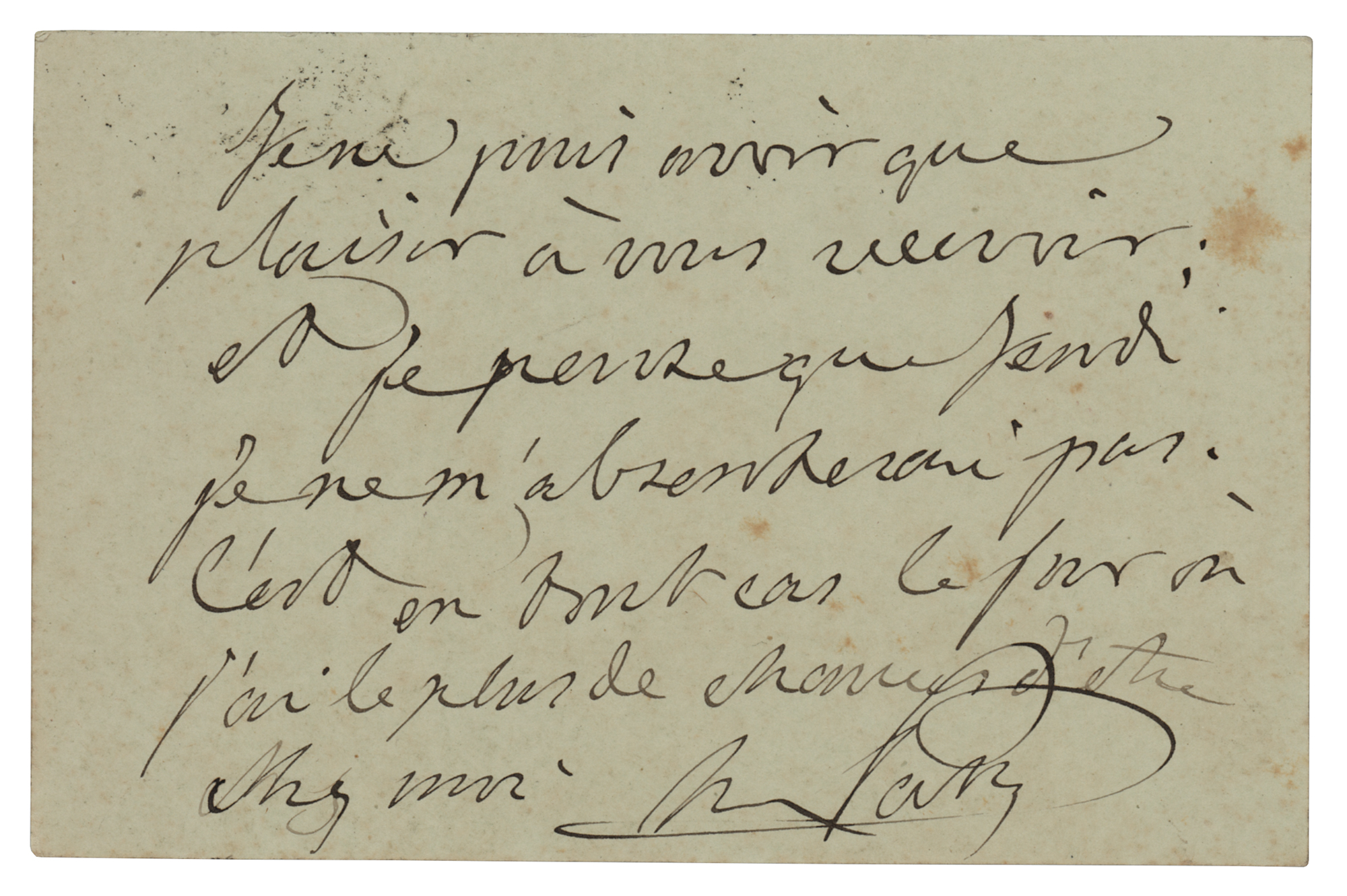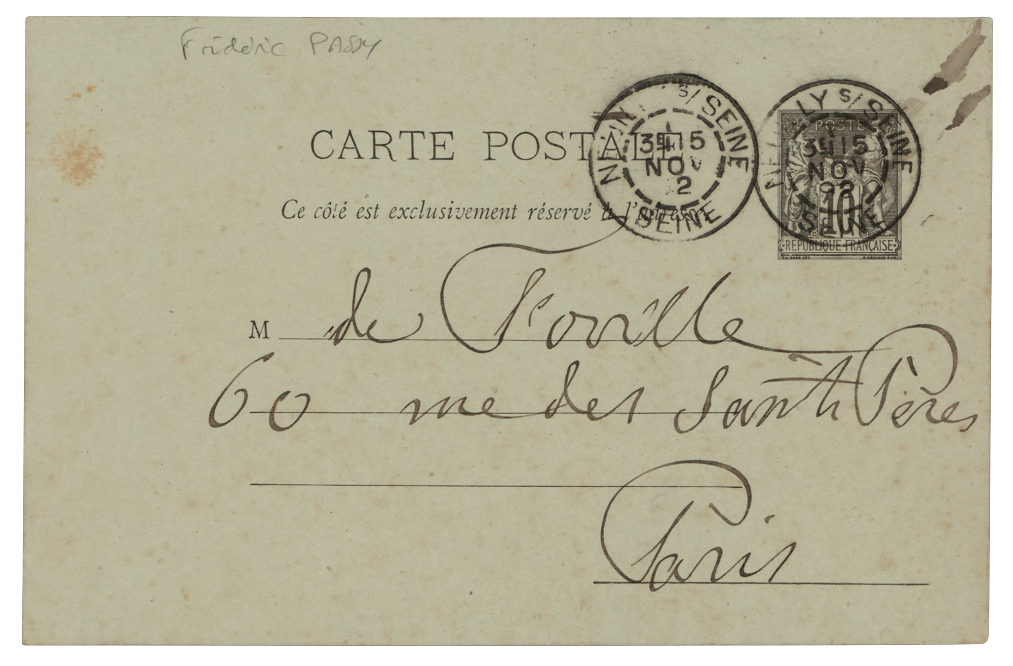 French economist (1822-1912) and a joint winner (together with Henry Dunant) of the first Nobel Peace Prize awarded in 1901. ALS in French, signed “F. Passy,” one page on a 5.5 x 3.5 postcard, no date. Untranslated handwritten letter by Passy. In fine condition.