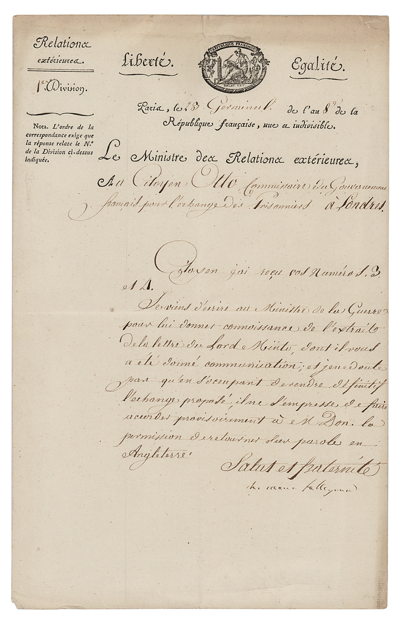 Highly skilled and influential diplomat (1754-1838) who served the French government from the reign of Louis XVI through that of Louis-Philippe. Manuscript DS in French, signed “Ch. Maur. Talleyrand,” one page, 7.75 x 12.5, April 18, 1800. Untranslated military document signed at the conclusion by Talleyrand. In fine condition, with some edge creasing.