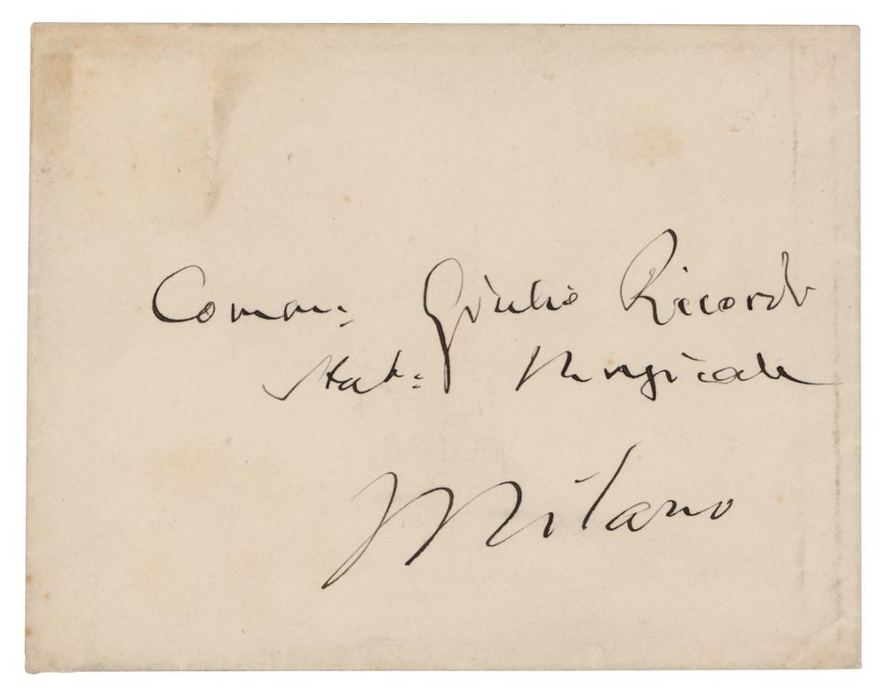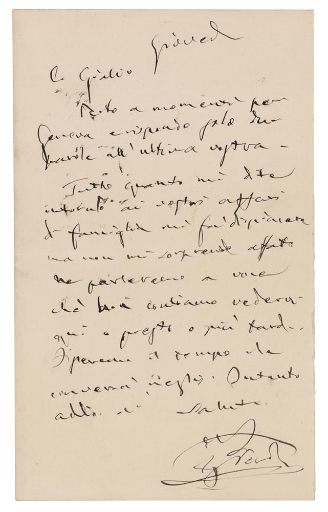 Italian composer (1813-1901) who was one of the most influential figures in the history of opera. ALS in Italian, signed “G. Verdi,” one page, 4.25 x 7, no date. Untranslated handwritten letter to music publisher Giulio Ricordi. In fine condition. Accompanied by the original mailing envelope, addressed in Verdi's own hand.