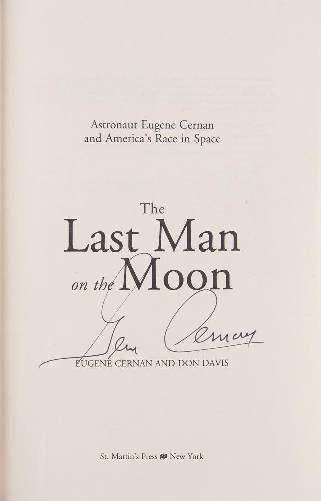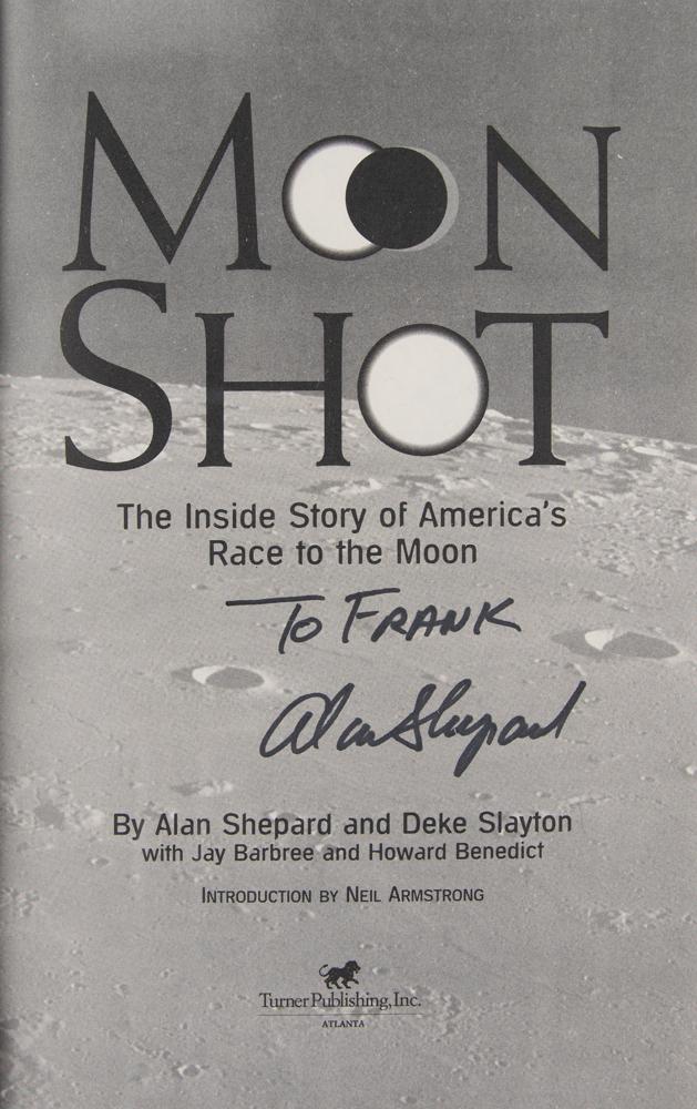 Three books, each hardcover with dust jacket, individually signed by an Apollo moonwalker—Encounter with Tiber, published by Warner Books in 1996, signed on the title page in blue ink by Buzz Aldrin; a first edition of The Last Man on the Moon, published by st. Martin’s Press in 1999, signed on the tile page in black ink by Gene Cernan; and a first edition of Moon Shot, published by Turner Publishing in 1994, signed and inscribed on the title page in black felt tip by Alan Shepard. In overall fine condition.