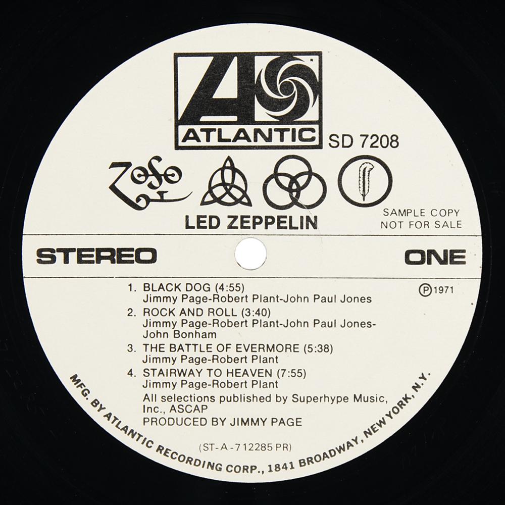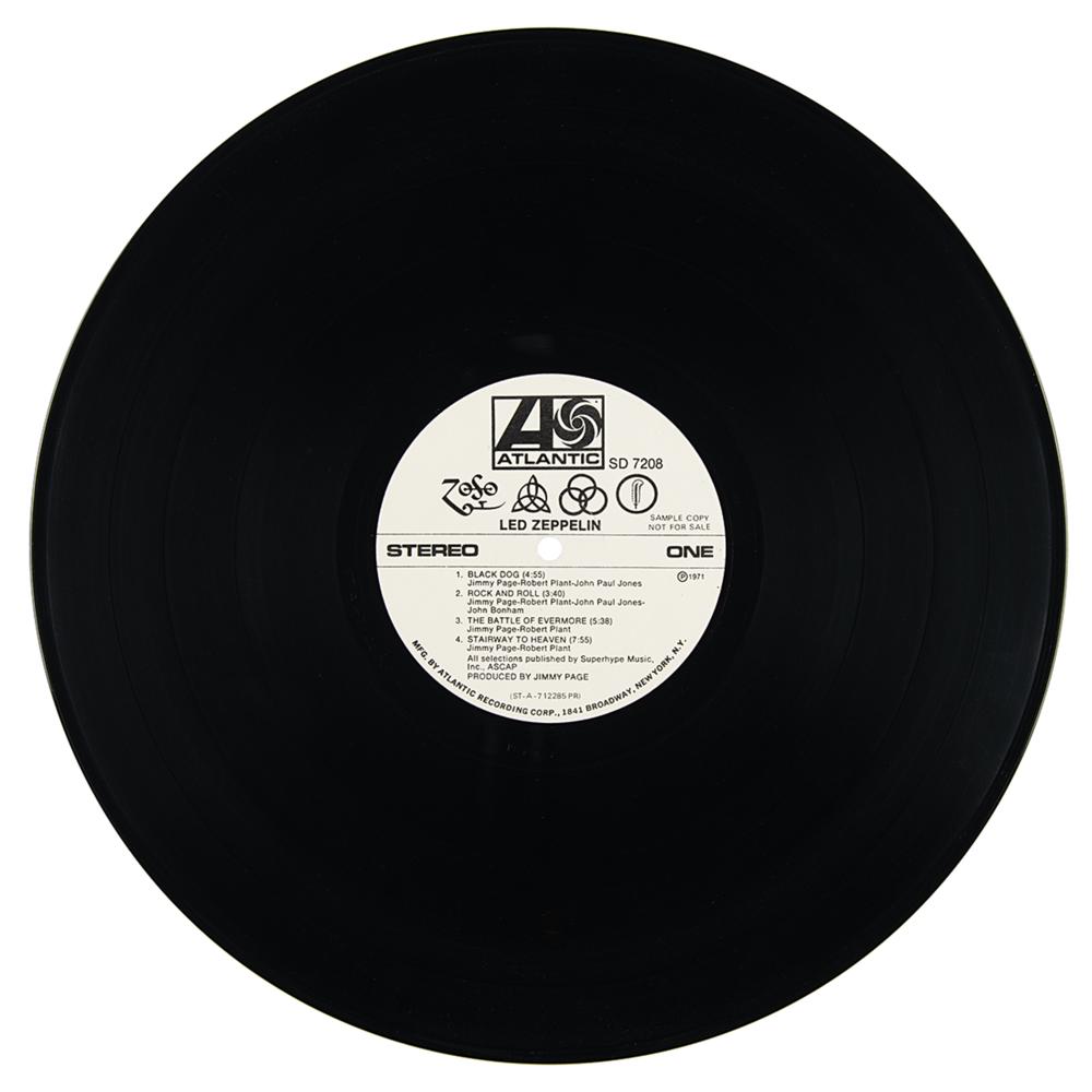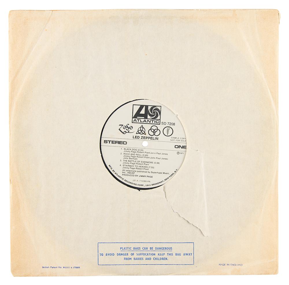 Extremely rare U.S. promotional first pressing of Led Zeppelin’s untitled fourth studio album, commonly known as Led Zeppelin IV (Atlantic Records, SD 7208, Stereo), with side one and side two labels marked “Sample Copy, Not For Sale.” The record includes its original plain white sleeve, with the front cover stamped "New! Led Zeppelin Release" and bearing a rare affixed ‘hype’ label that contains the album’s tracklist. The matrix and runout numbers to both sides read, in part: "ST-A-712285-F, Porky?PR" and "ST-A-712286-F, Pecko Duck?PR." In fine condition, with edgewear and some rubbing to covers. The record is included.