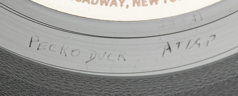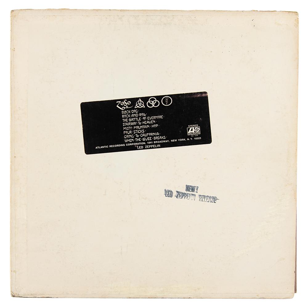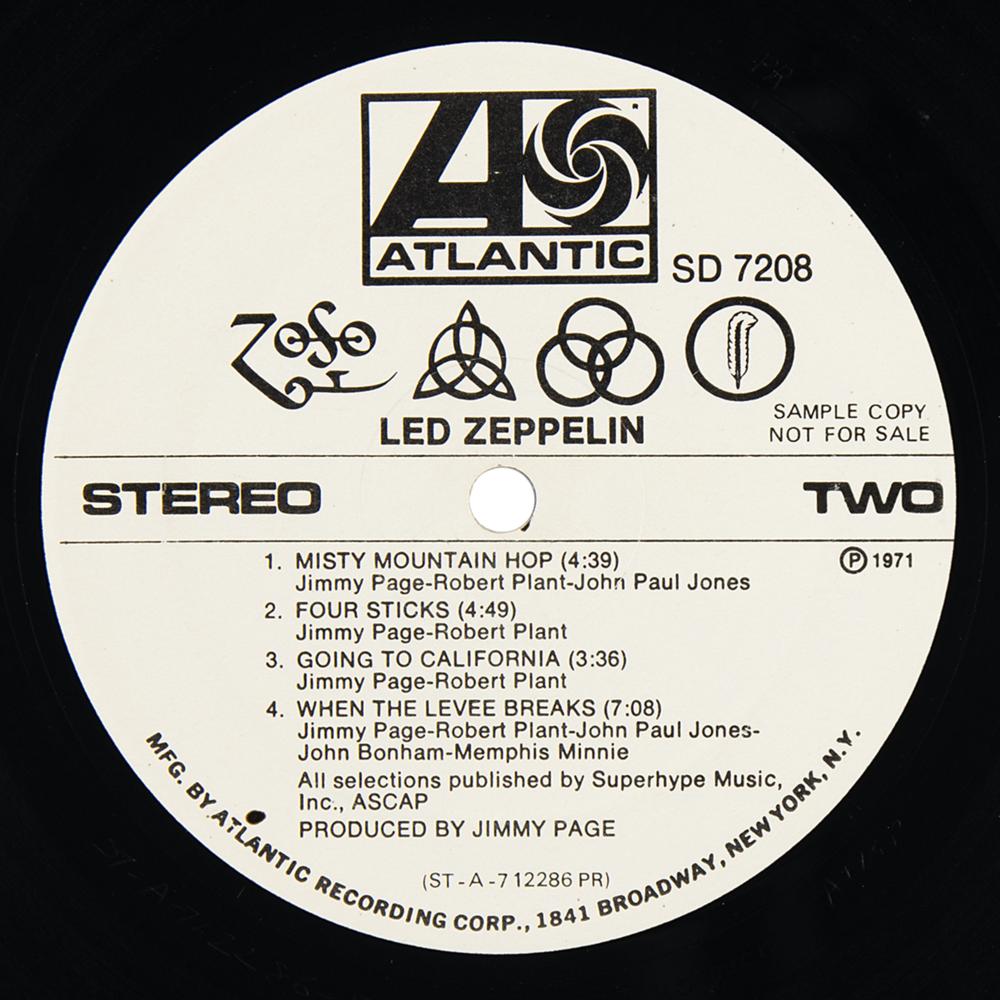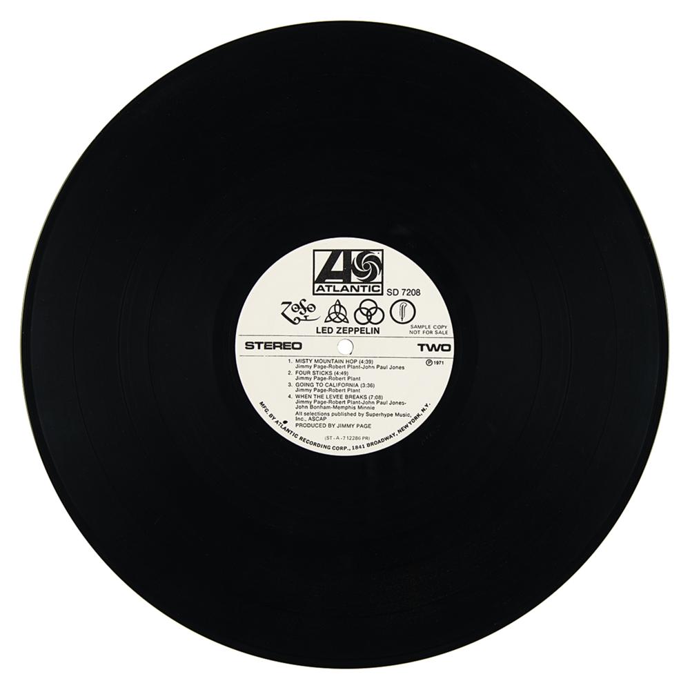 Extremely rare U.S. promotional first pressing of Led Zeppelin’s untitled fourth studio album, commonly known as Led Zeppelin IV (Atlantic Records, SD 7208, Stereo), with side one and side two labels marked “Sample Copy, Not For Sale.” The record includes its original plain white sleeve, with the front cover stamped "New! Led Zeppelin Release" and bearing a rare affixed ‘hype’ label that contains the album’s tracklist. The matrix and runout numbers to both sides read, in part: "ST-A-712285-F, Porky?PR" and "ST-A-712286-F, Pecko Duck?PR." In fine condition, with edgewear and some rubbing to covers. The record is included.